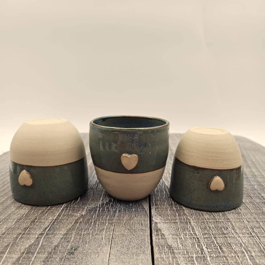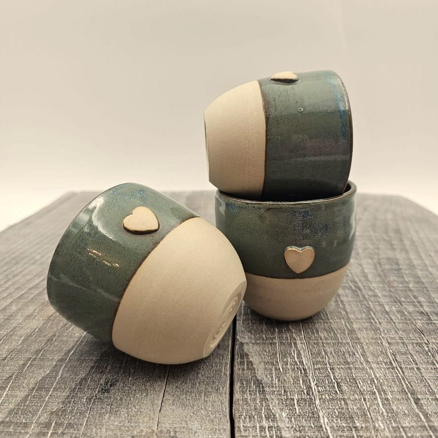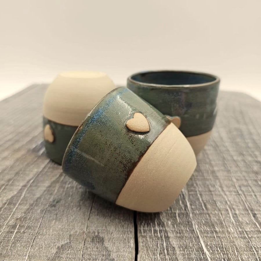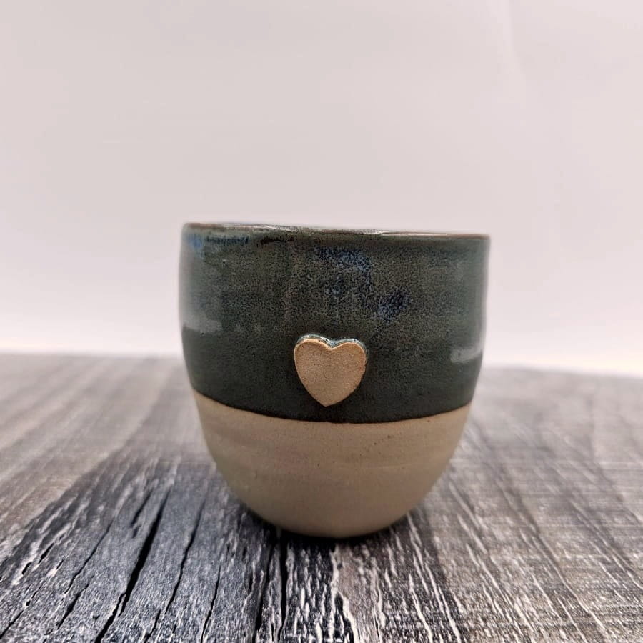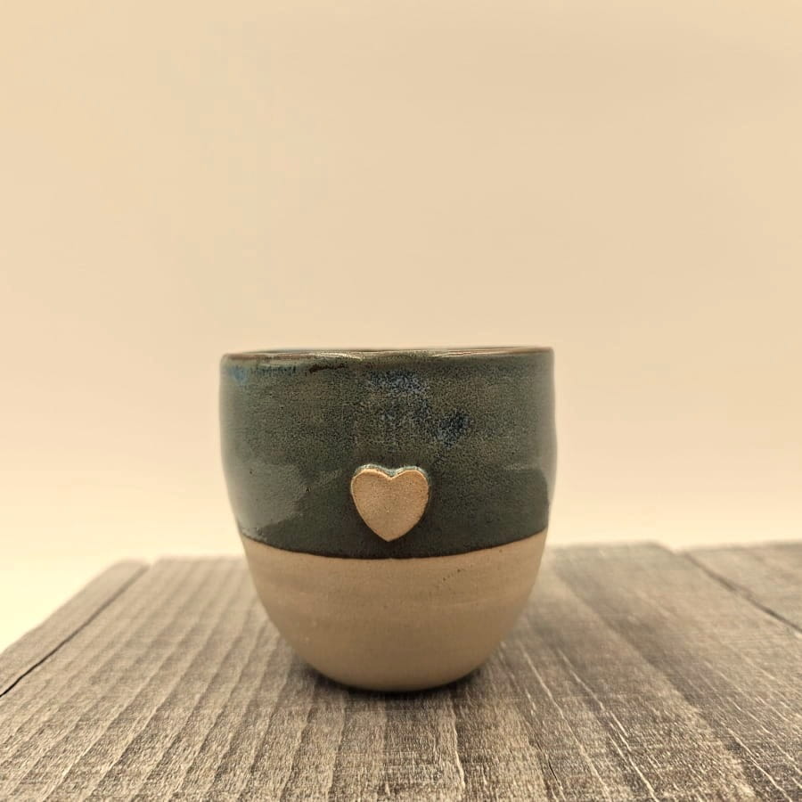 Czarka ceramiczna / duże espresso zielono-niebieska z serduszkiem w kolorze gliny.