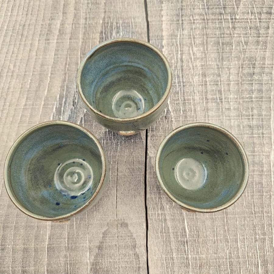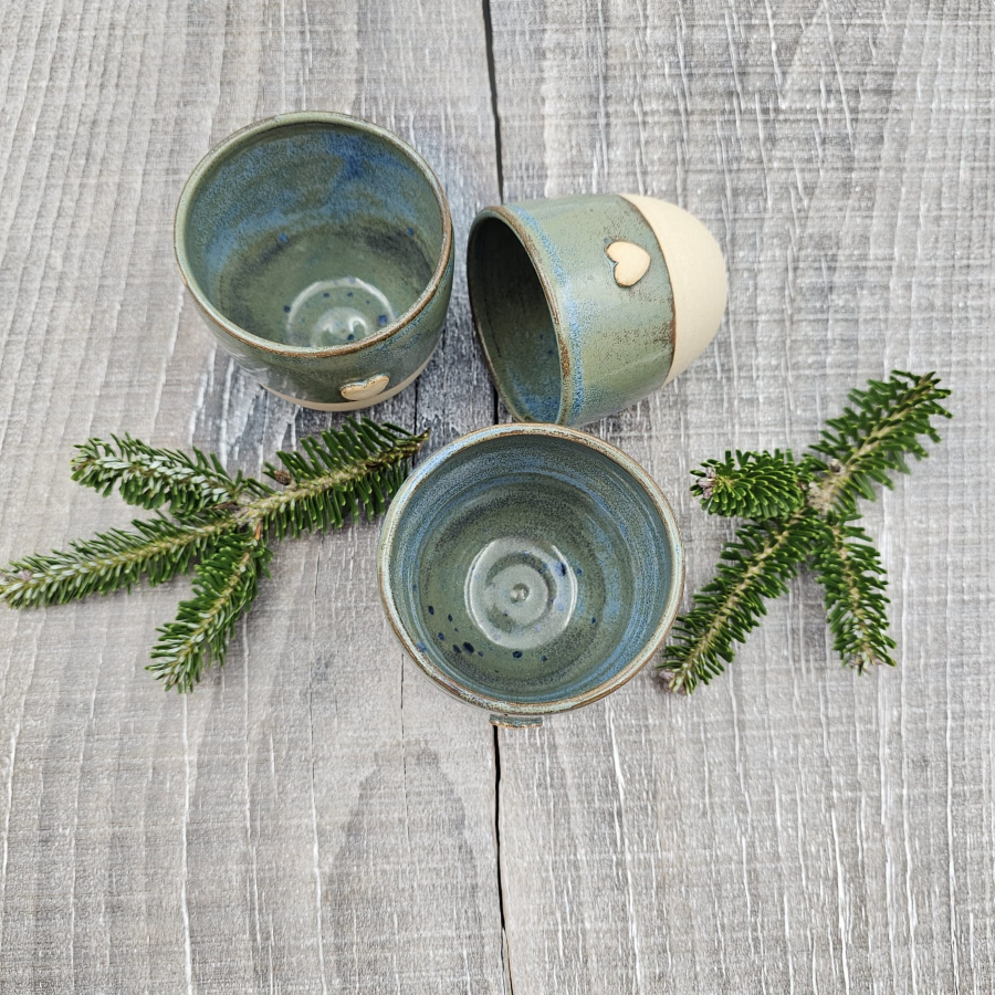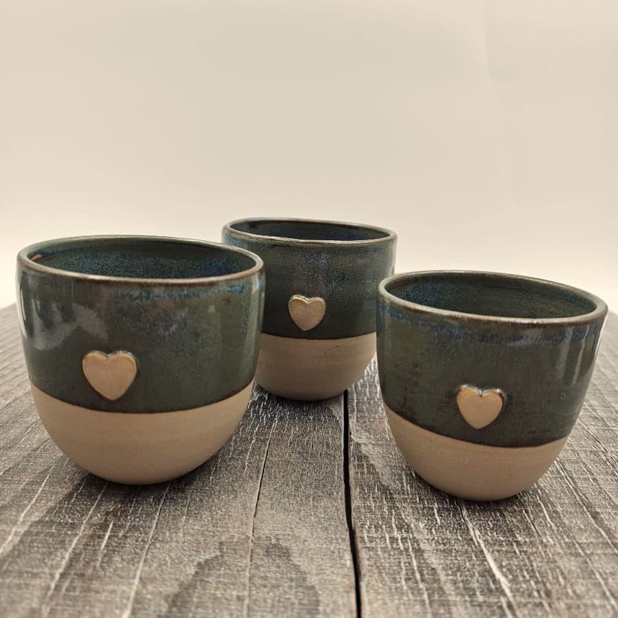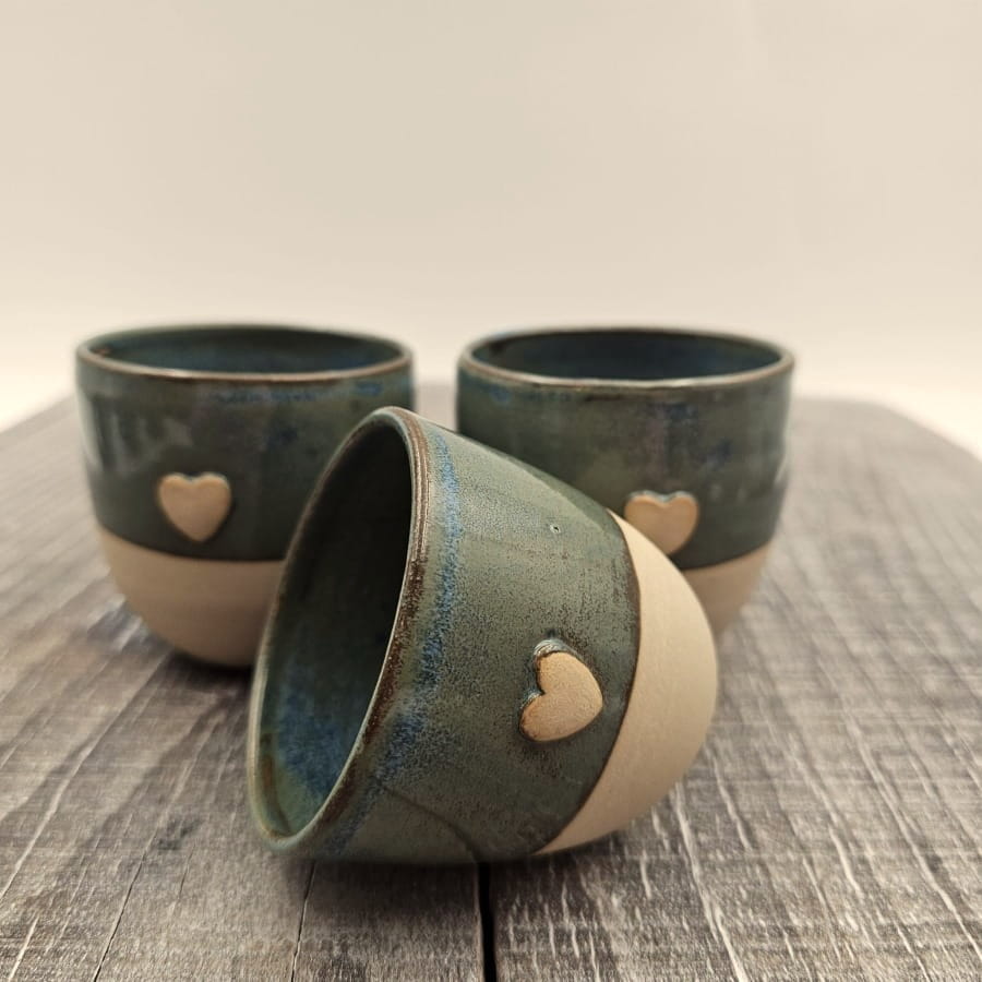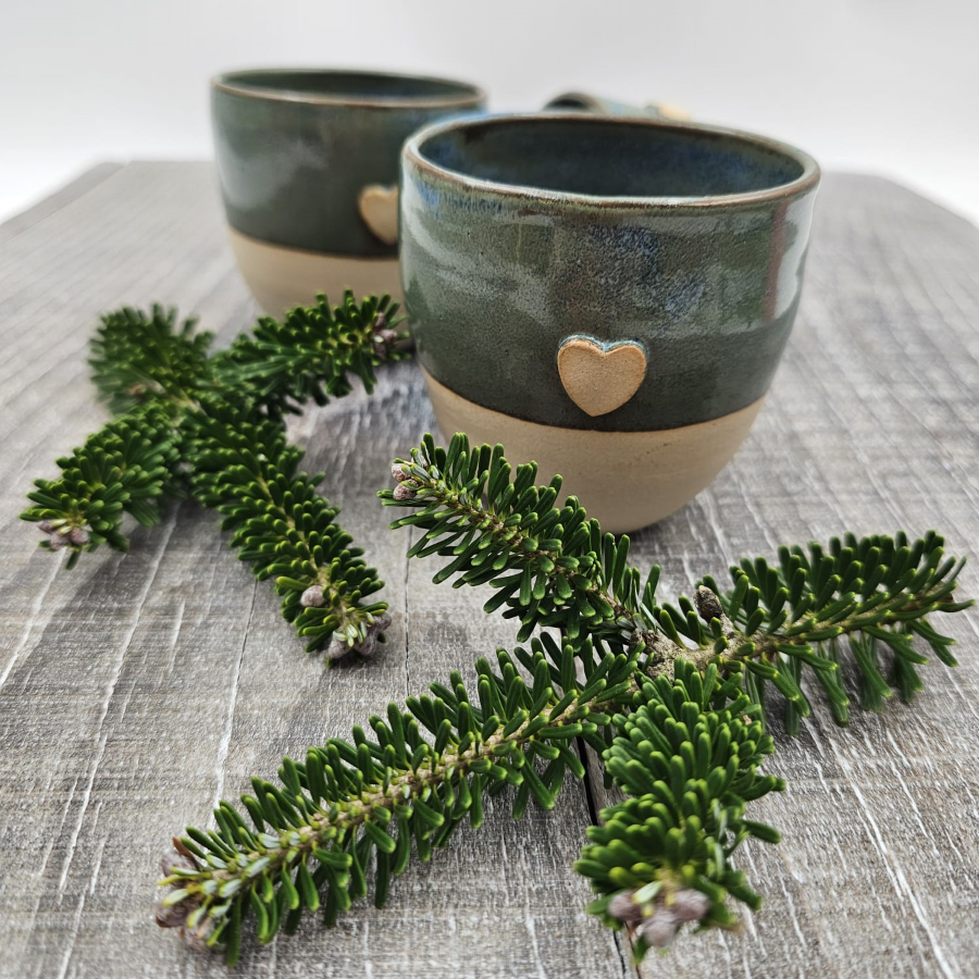 Czarka ceramiczna / duże espresso zielono-niebieska z serduszkiem w kolorze gliny.