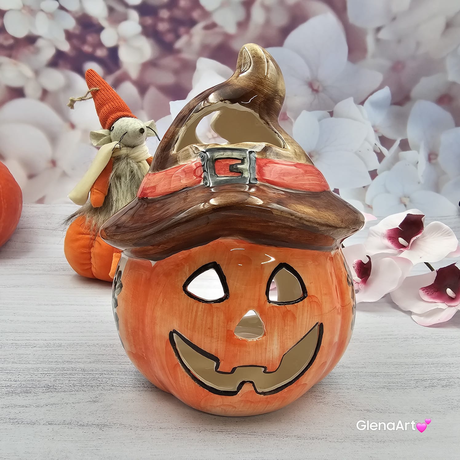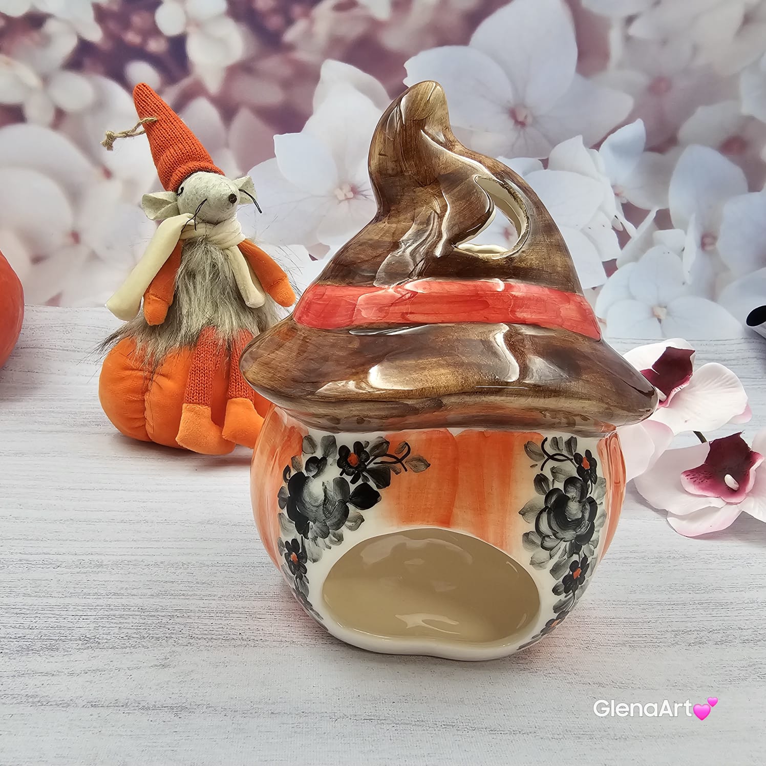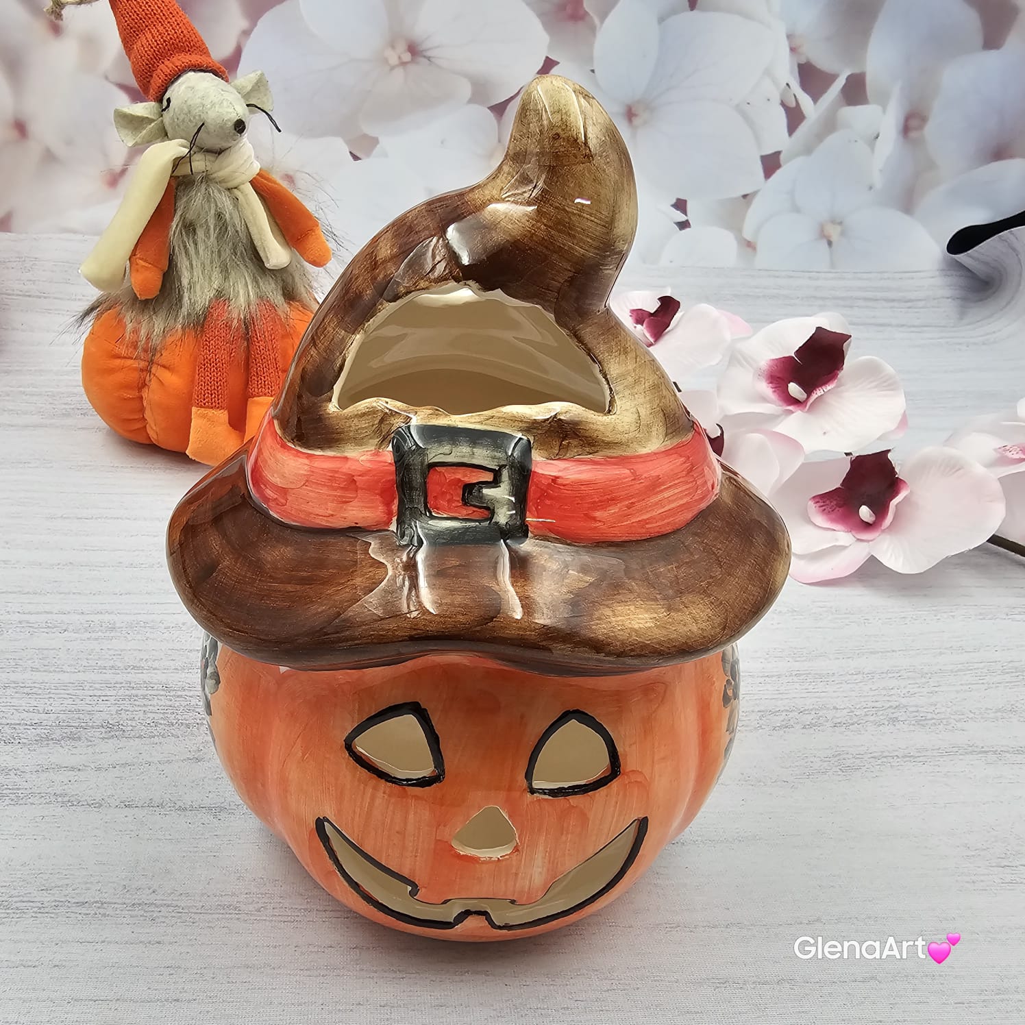 Dynia ceramiczna w kapeluszu kolorowy lampion dynia na świecę Fajans Włocławek figurka dynia pomarańczowa czarne kwiaty brąz