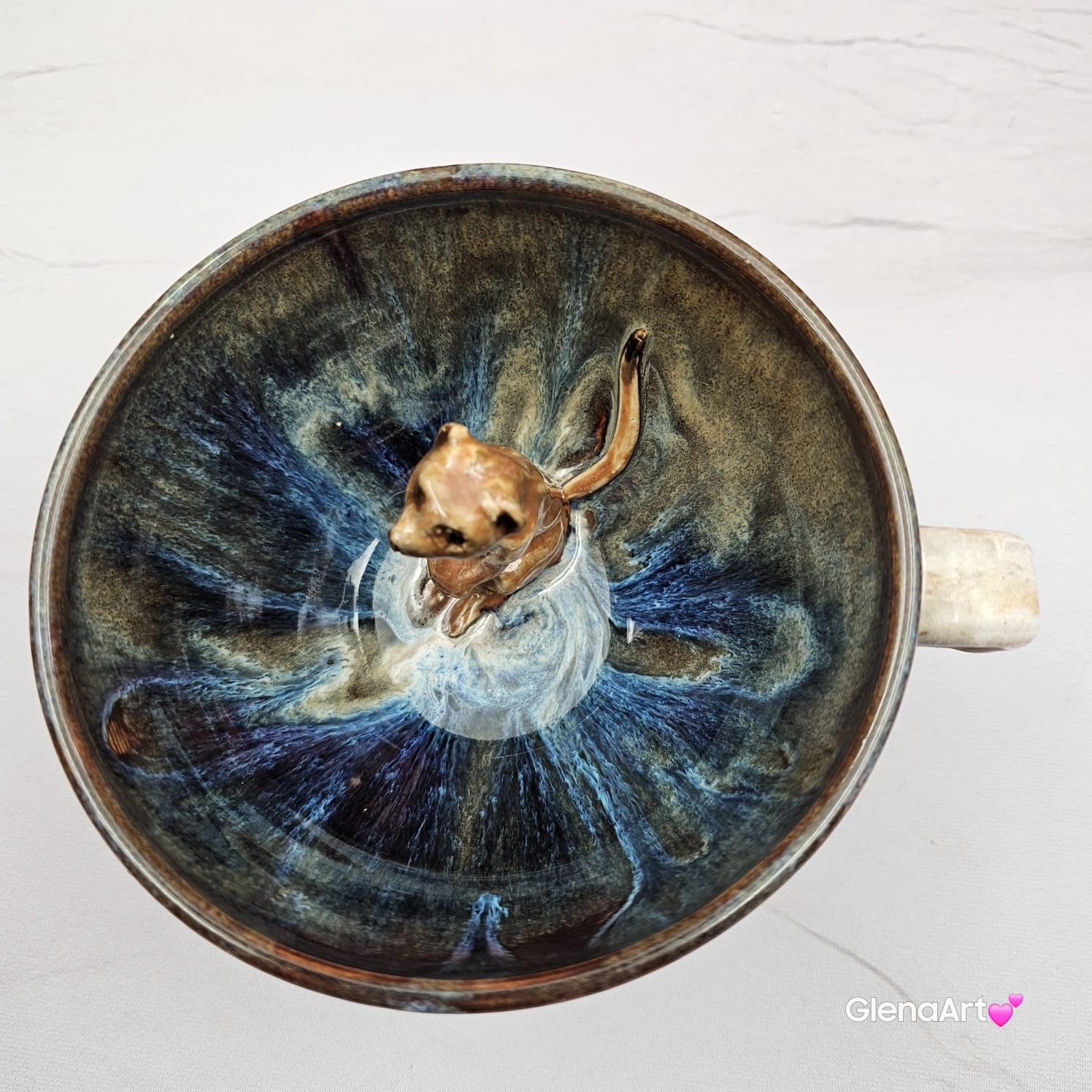 Filiżanka Surykatka ceramiczna ze spodkiem i surykatką w środku ręcznie toczona i malowana ciemny beż niebieski brąz elegancka filiżanka z zabawnym zwierzątkiem w środku surykatka kubek