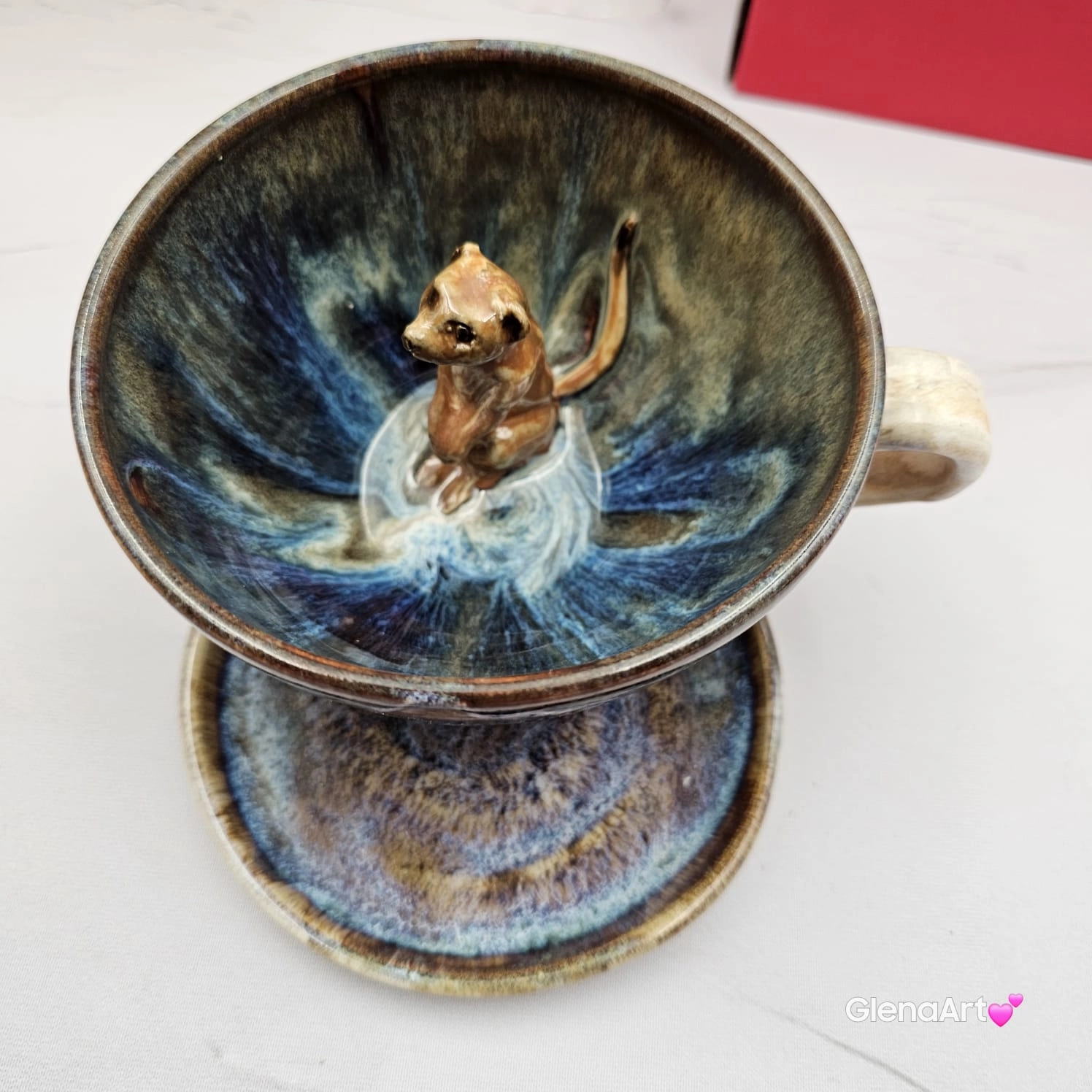 Przepiękna filiżanka z figurką surykatki wewnątrz filiżanki.