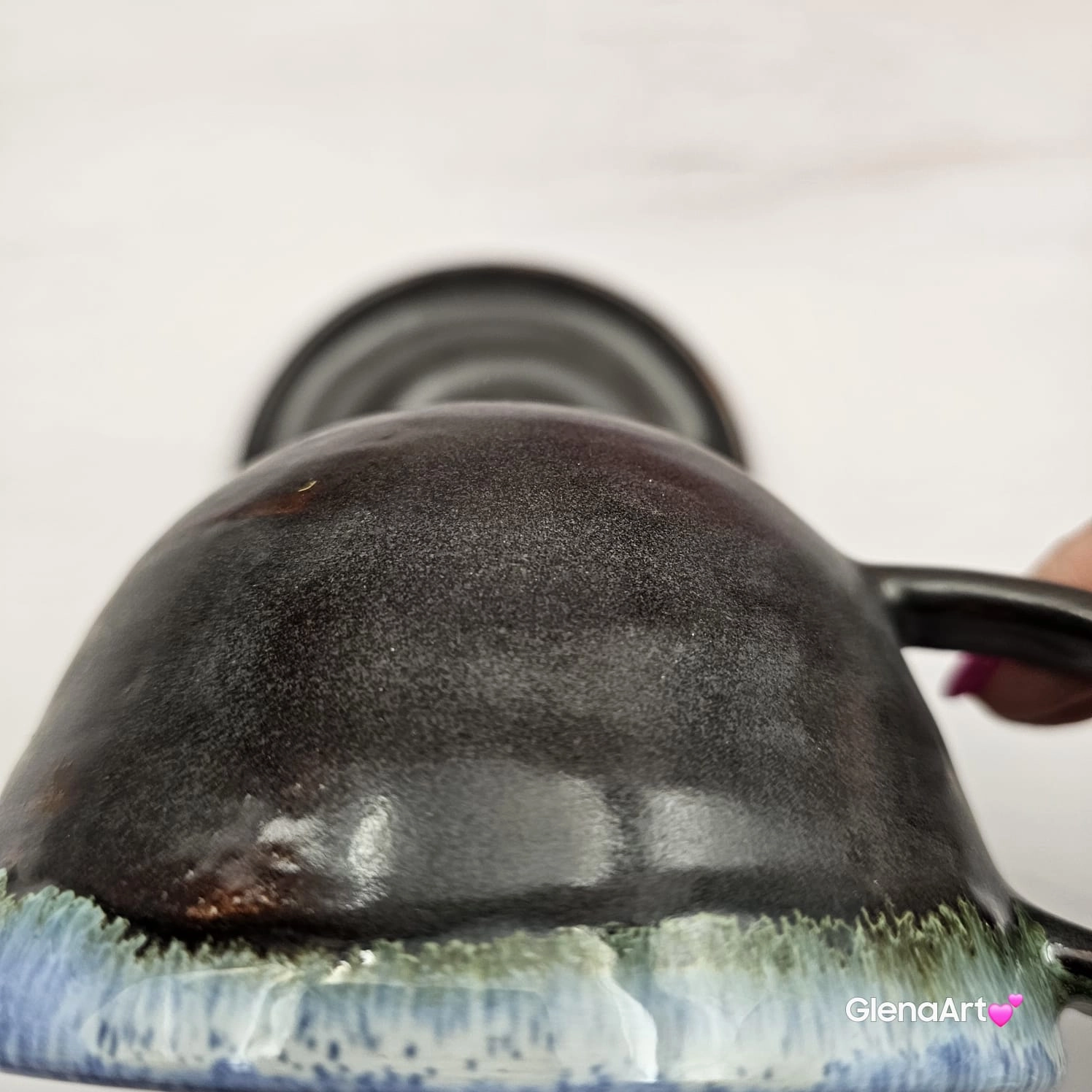 Szkliwo w jasnych barwach niebieskich wewnątrz, na zewnątrz ciemno brązowe / grafitowe.