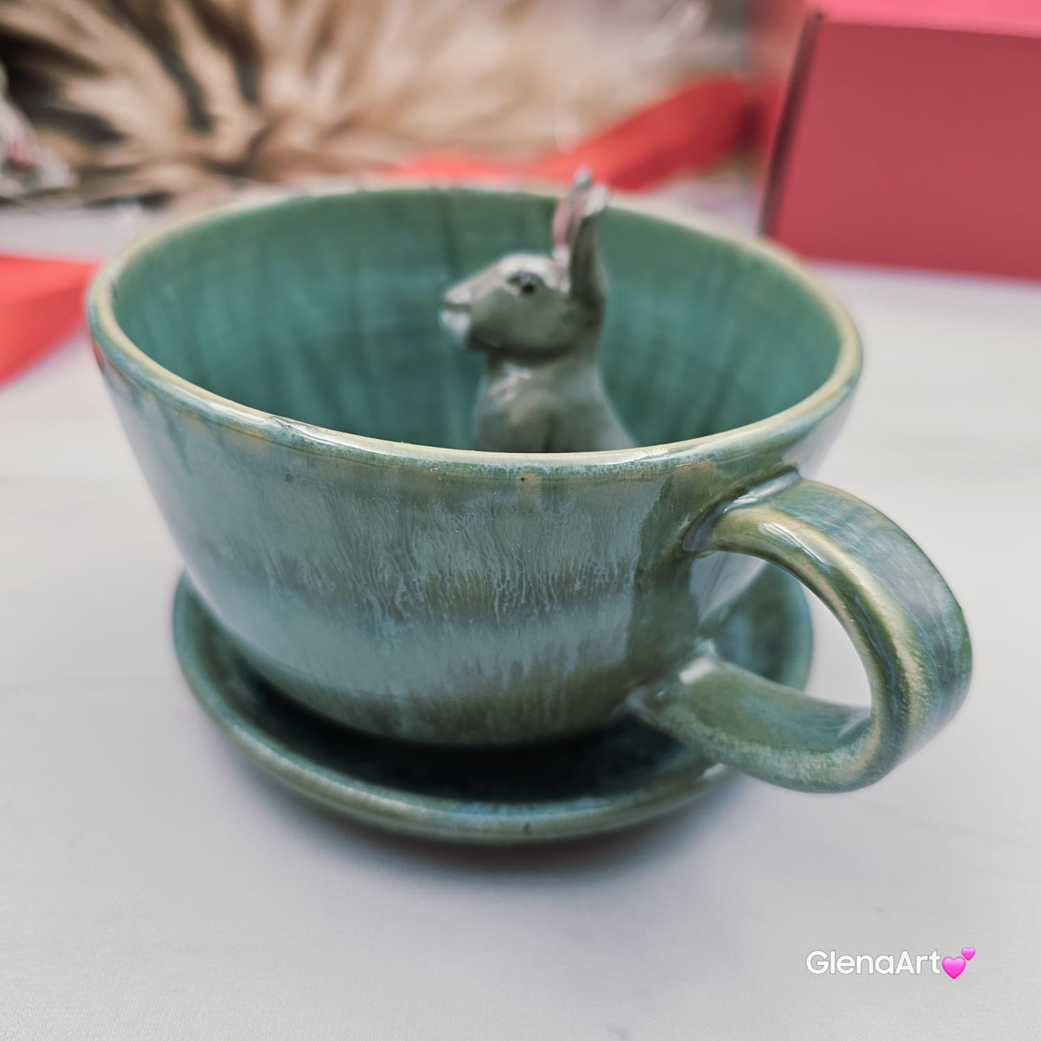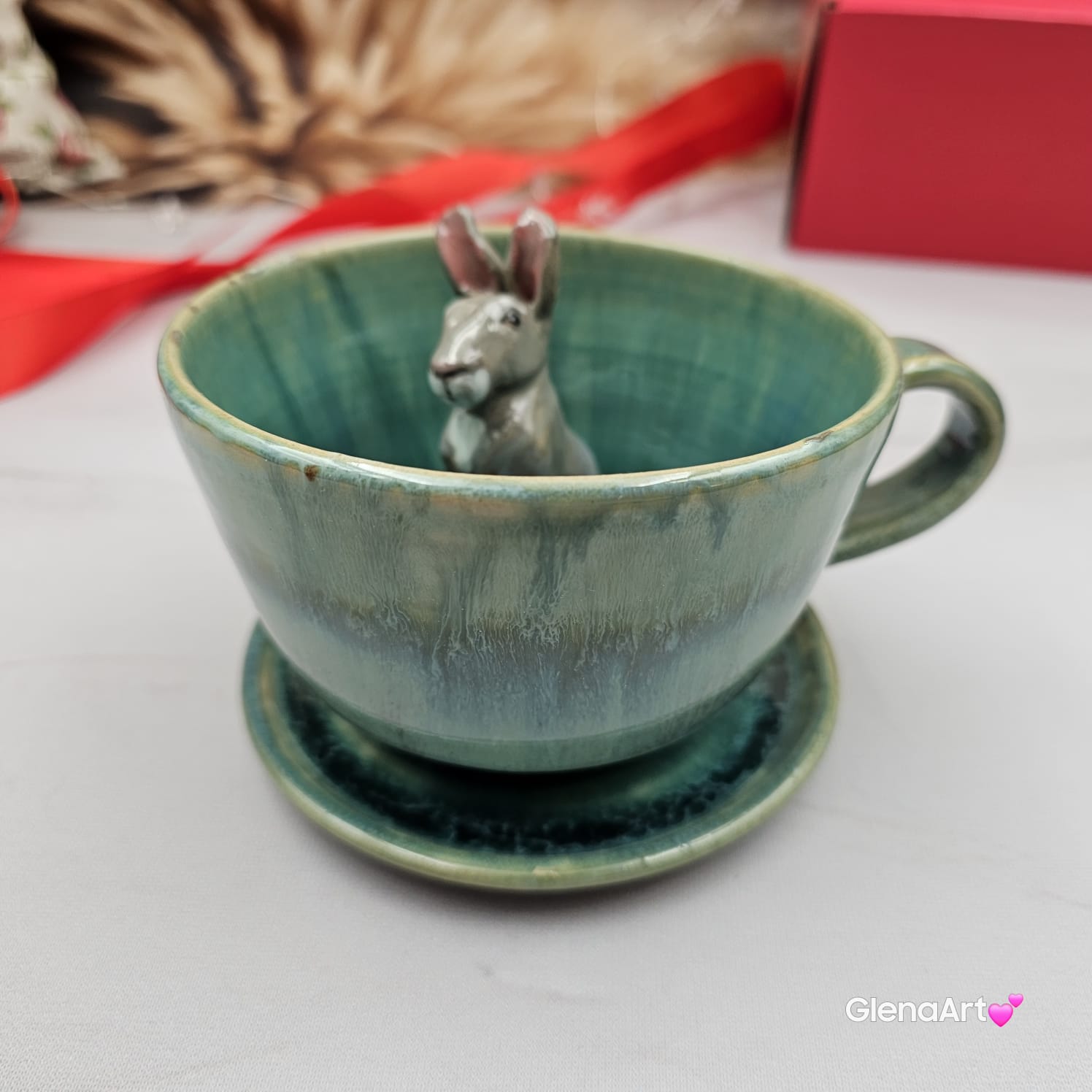 Filiżanka ZAJĄC ceramiczna ze spodkiem z ZAJĄCEM szarakiem w środku ręcznie toczona i malowana w kolorze niebieskim i zielonym - turkusowe jeziorko kubek zając z zającem szarakiem Wielkanoc