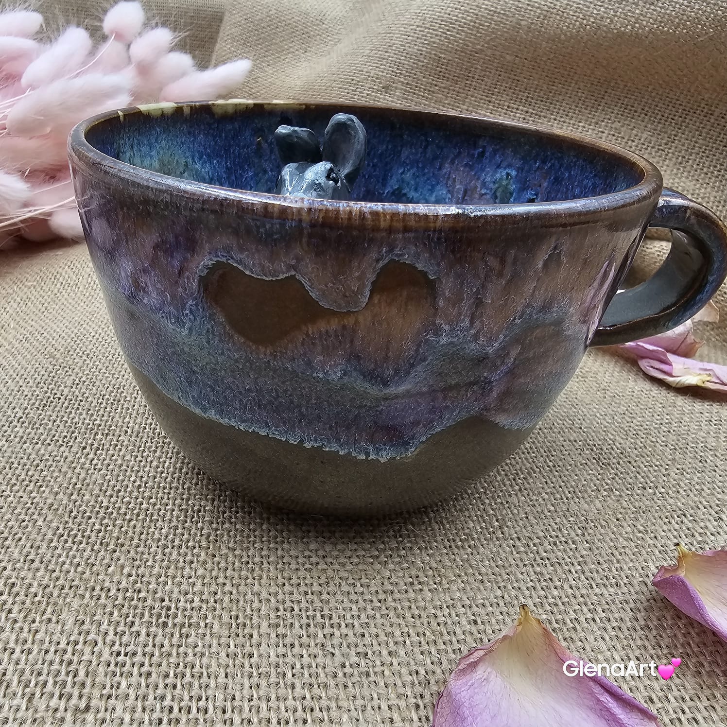 Przepiękna filiżanka z figurką Zająca wewnątrz filiżanki. Ręcznie wytoczone na kole garncarskim. Figurka zająca ulepiona ręcznie. Bez spodka.