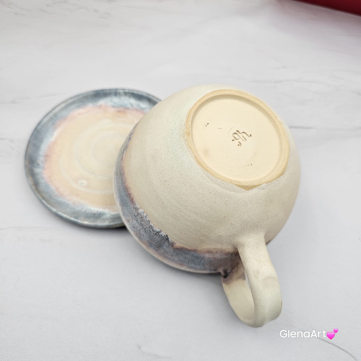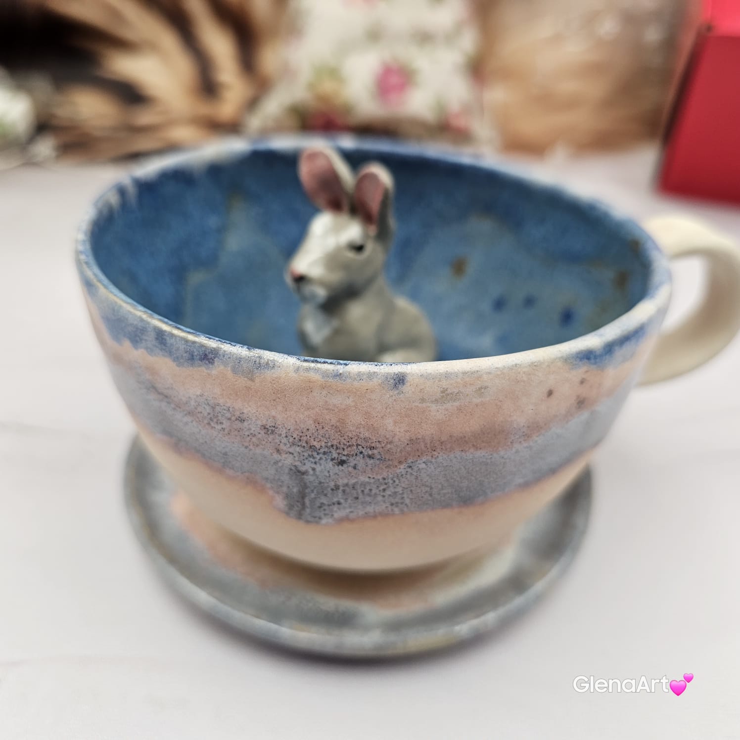 Filiżanka ZAJĄC z ZAJĄCEM SZARAKIEM ceramiczna ze spodkiem i zwierzakiem w środku ręcznie toczona i malowana elegancka filiżanka z pięknym szkliwem beżowym i niebieskim kubek zajączek