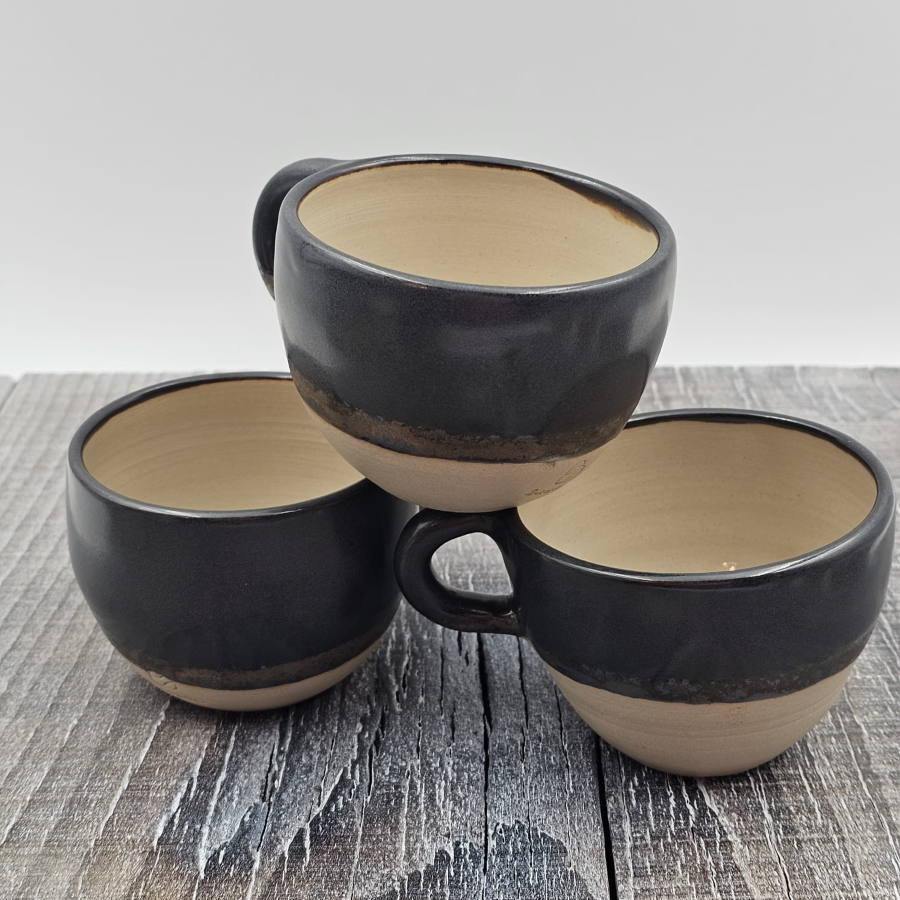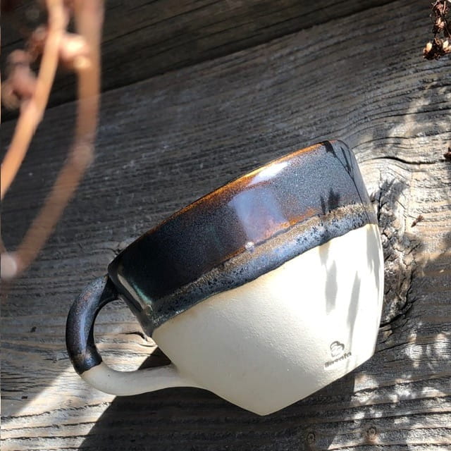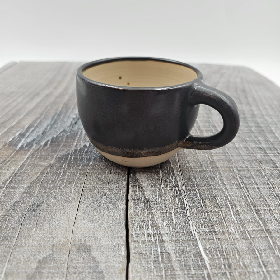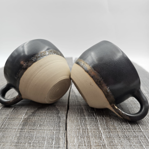 Filiżanka ceramiczna z uchem czarno-brązowa ze złotymi refleksami szkliwa.