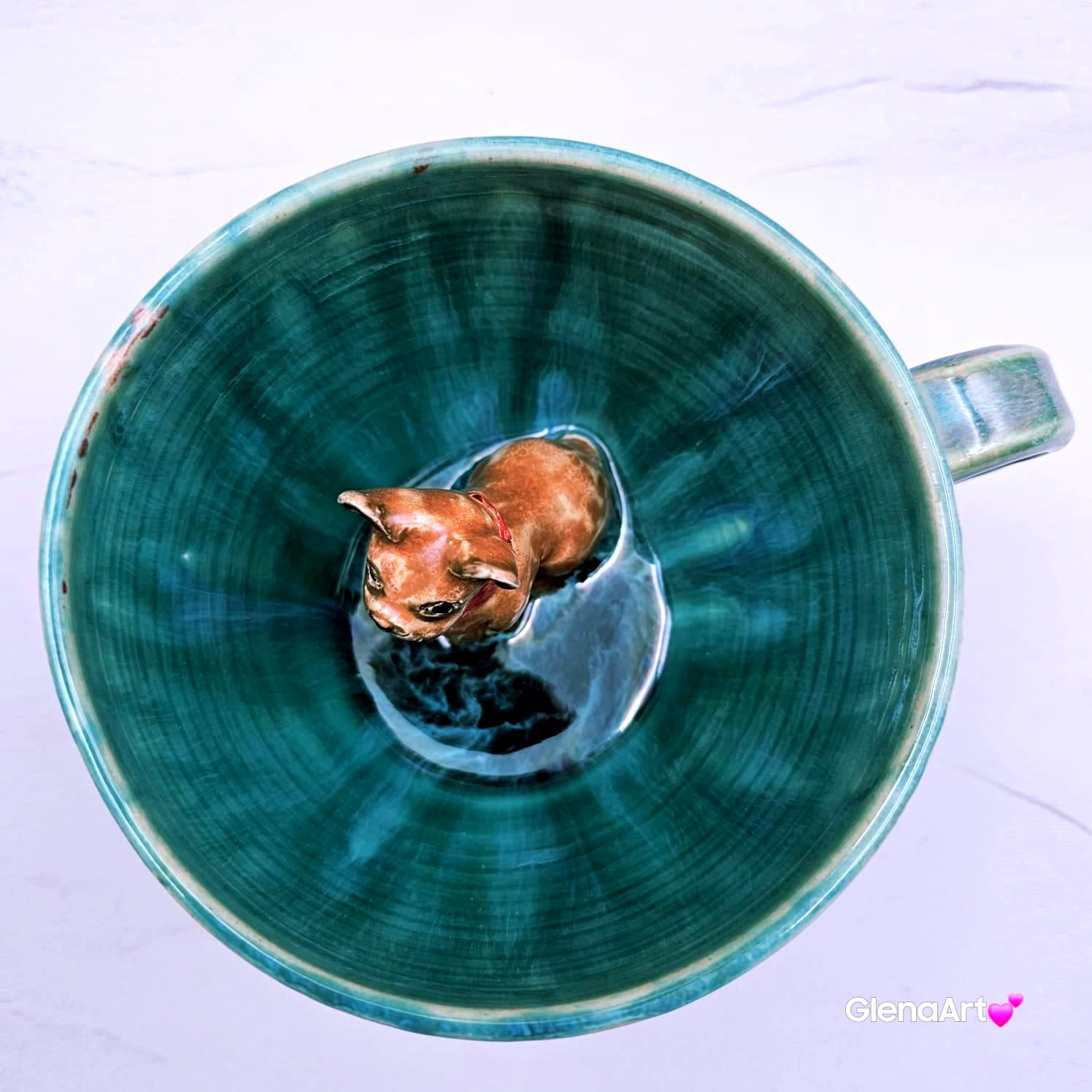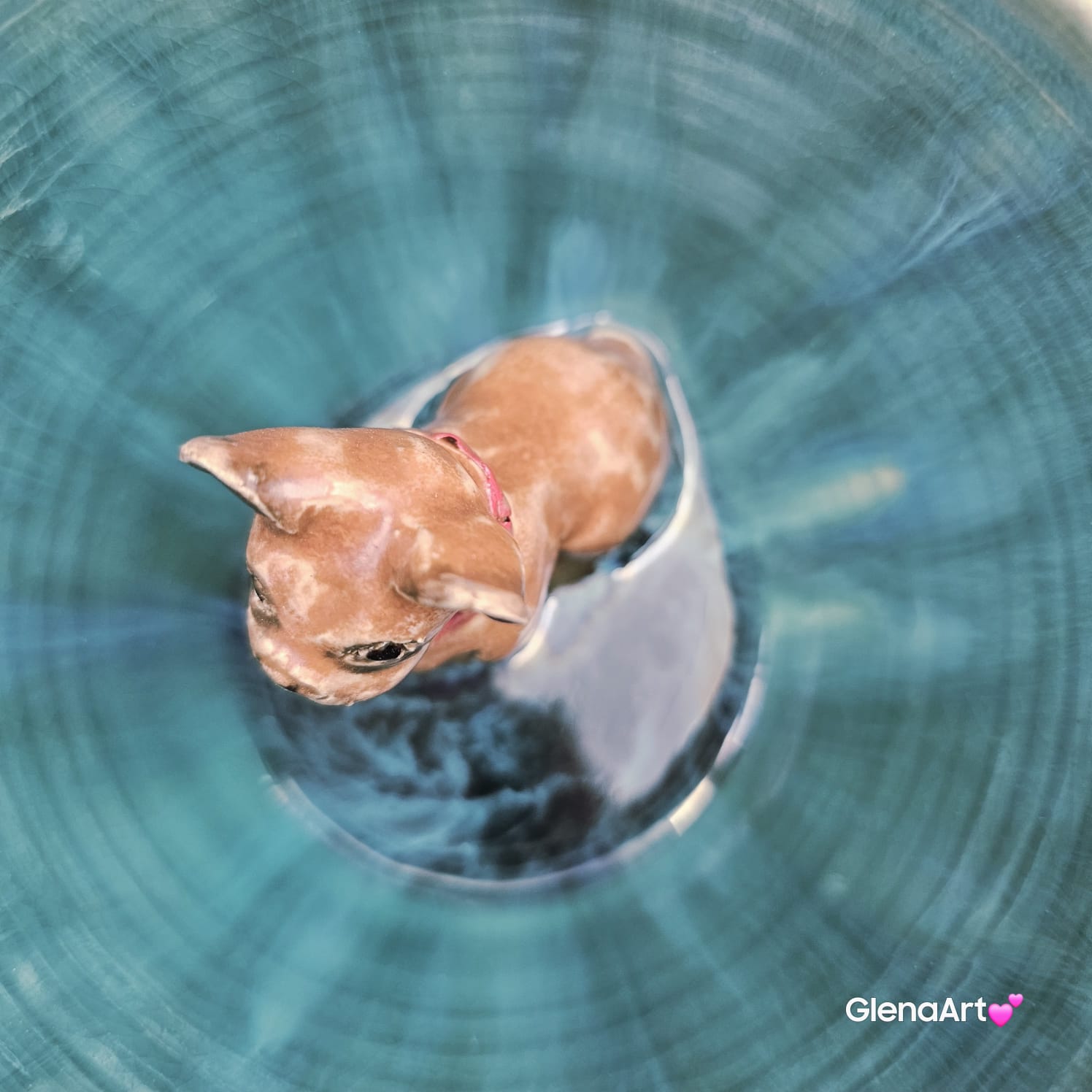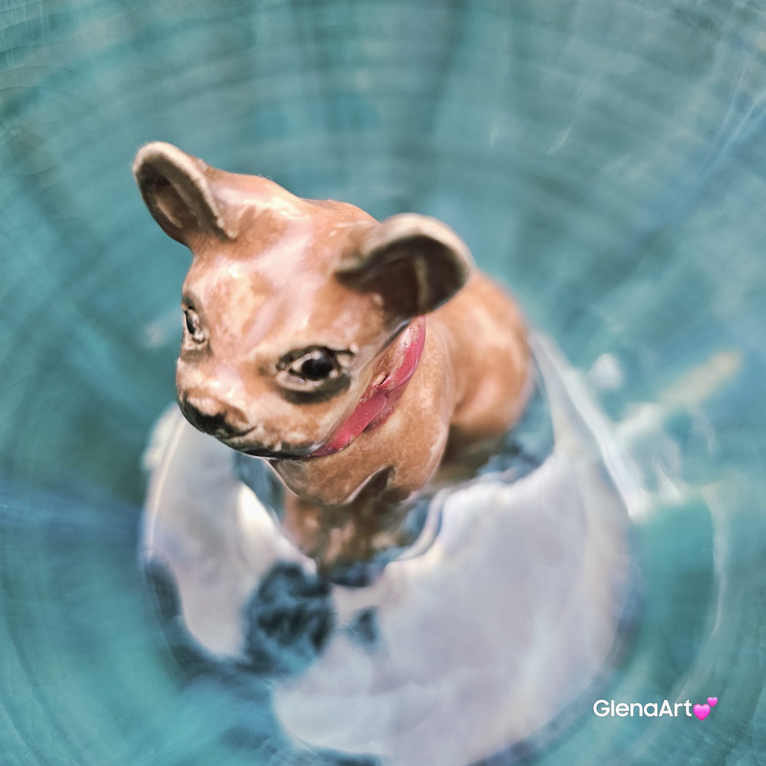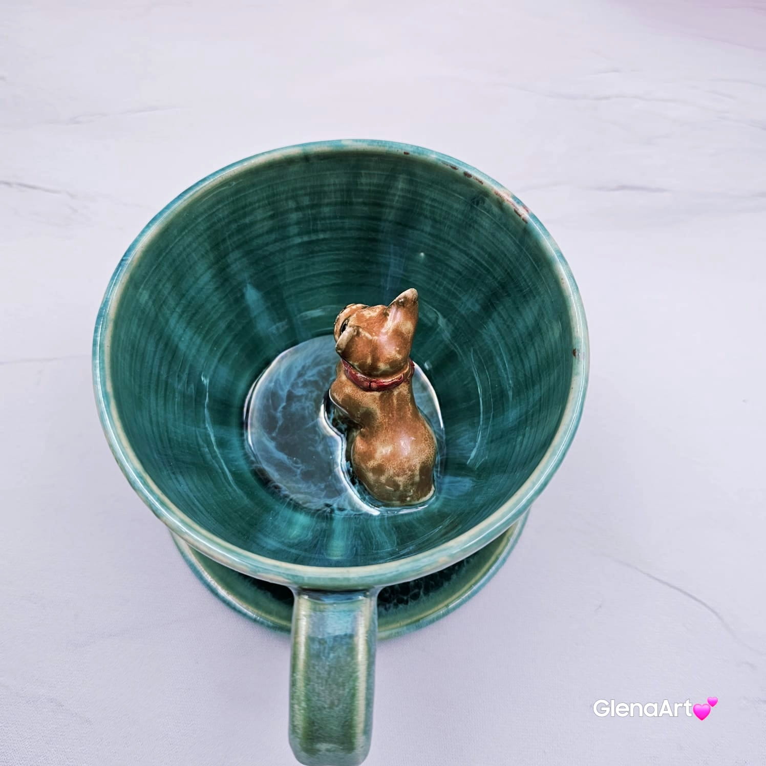 Pięknie wyszkliwiona. Elegancka filiżanka dla wielbiciela piesków. Szkliwa przenikające opal: zielone, błękitne i niebieskie czyli turkusowe jeziorko. Piesek brązowy jasny z czerwoną obróżką i bardzo radosny :)