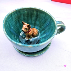 Filiżanka ceramiczna ze spodkiem i Buldożek francuski brązowy z czerwoną obróżką filiżanka ceramiczna ze spodkiem i zwierzakiem w środku ręcznie toczona i malowana elegancka filiżanka z pięknym szkliwem BULDOŻEK FRANCUSKI turkusowe jeziorko