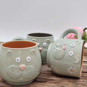 KUBEK ceramiczny KOT beczułka seledynowa 400 ml w kwiatki i bez kwiatków FAJNA CERAMIKA kolorowy kubek kubek KOT z kotem