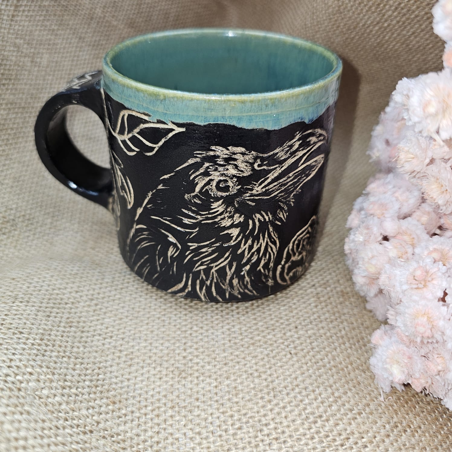 Przepiękny dość ciężki kubek z krukiem i motywem roślinnym. Kubek jest magiczny i trochę mroczny :)