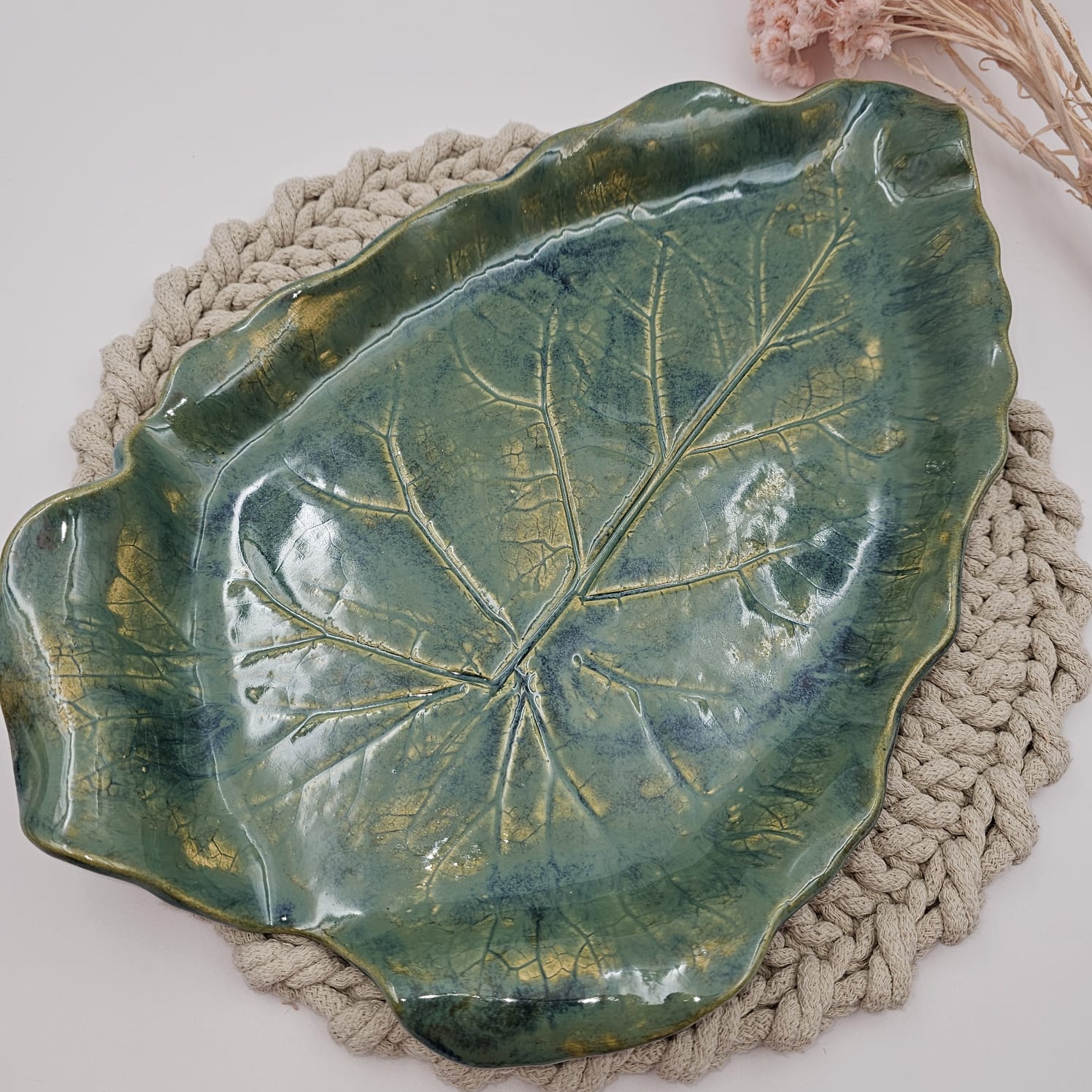 Patera ceramiczna duża LIŚĆ szmaragdowy. Ręcznie lepiona i zdobiona. Piękne rękodzieło.