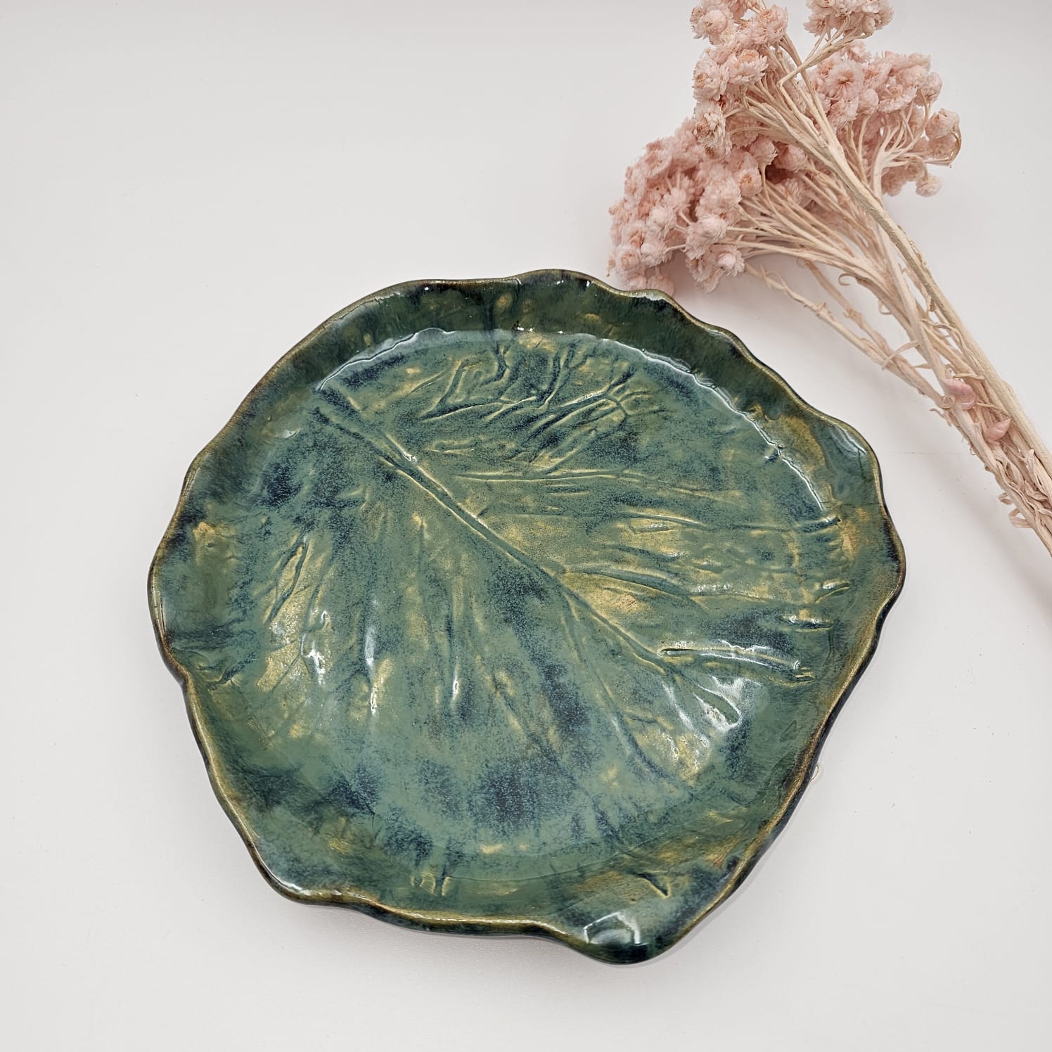 Patera ceramiczna LIŚĆ szmaragdowy. Ręcznie lepiona i zdobiona. Piękne rękodzieło.