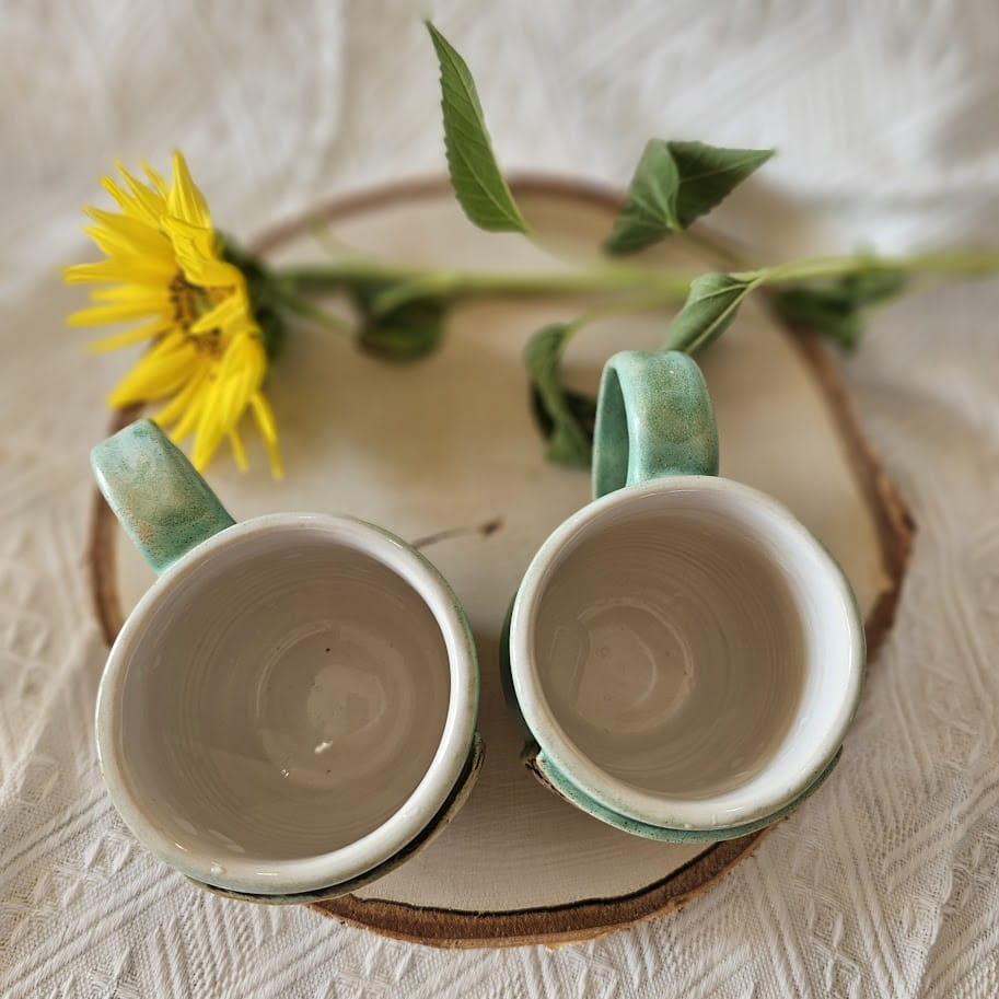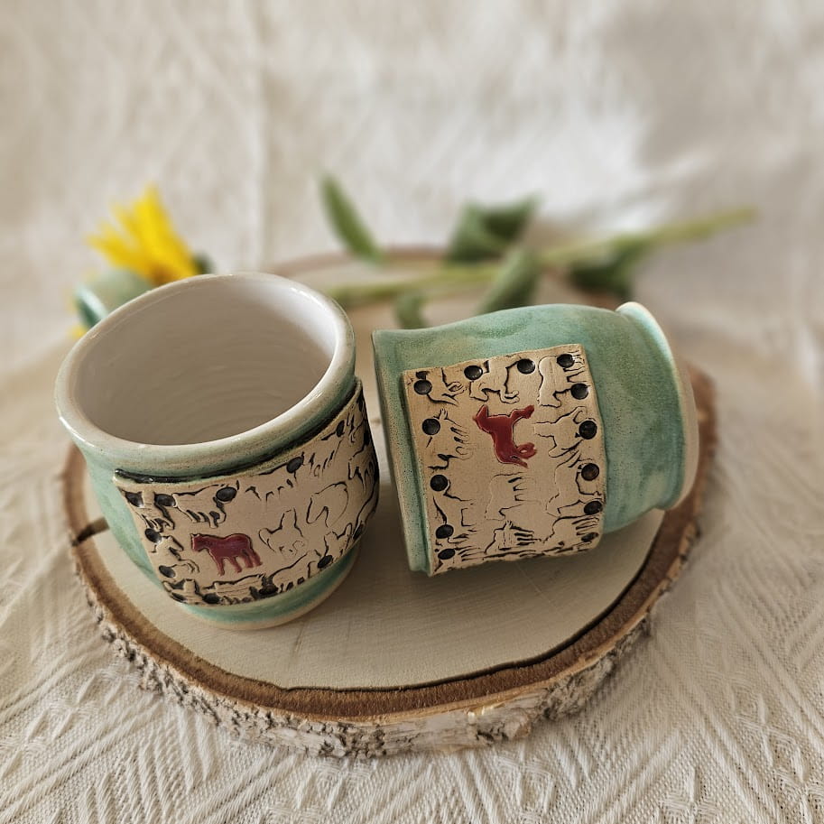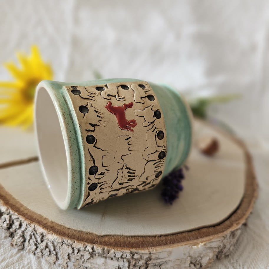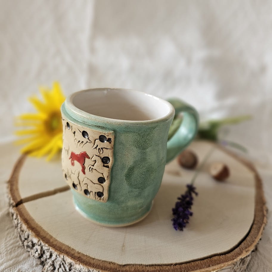Piękny kubek ceramiczny konie dość ciężki zielony kubek ręcznie toczony i malowany
