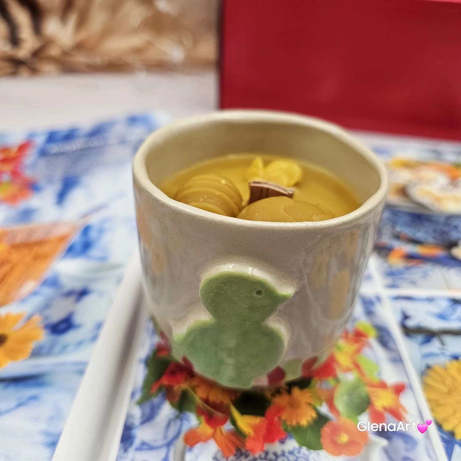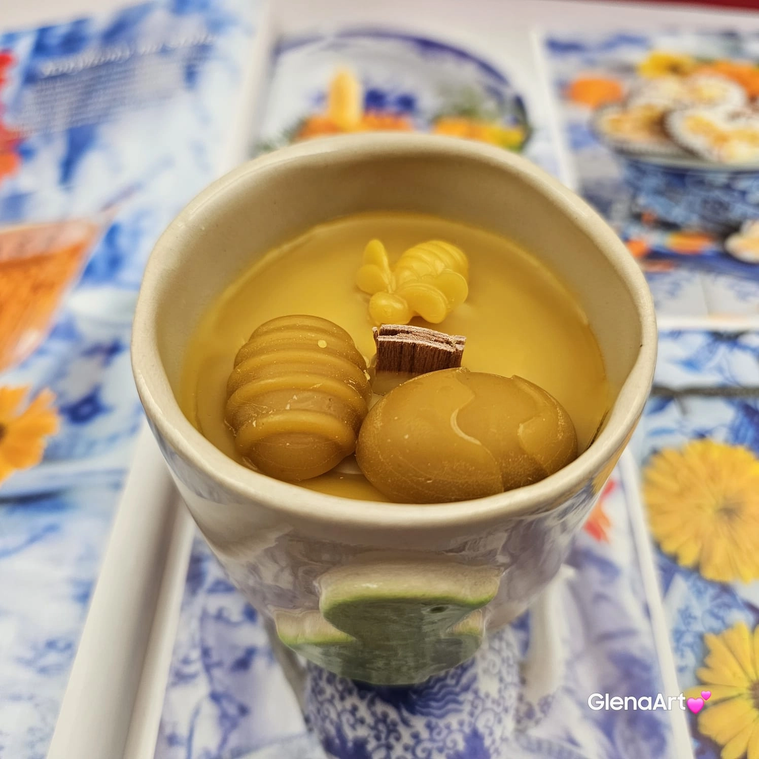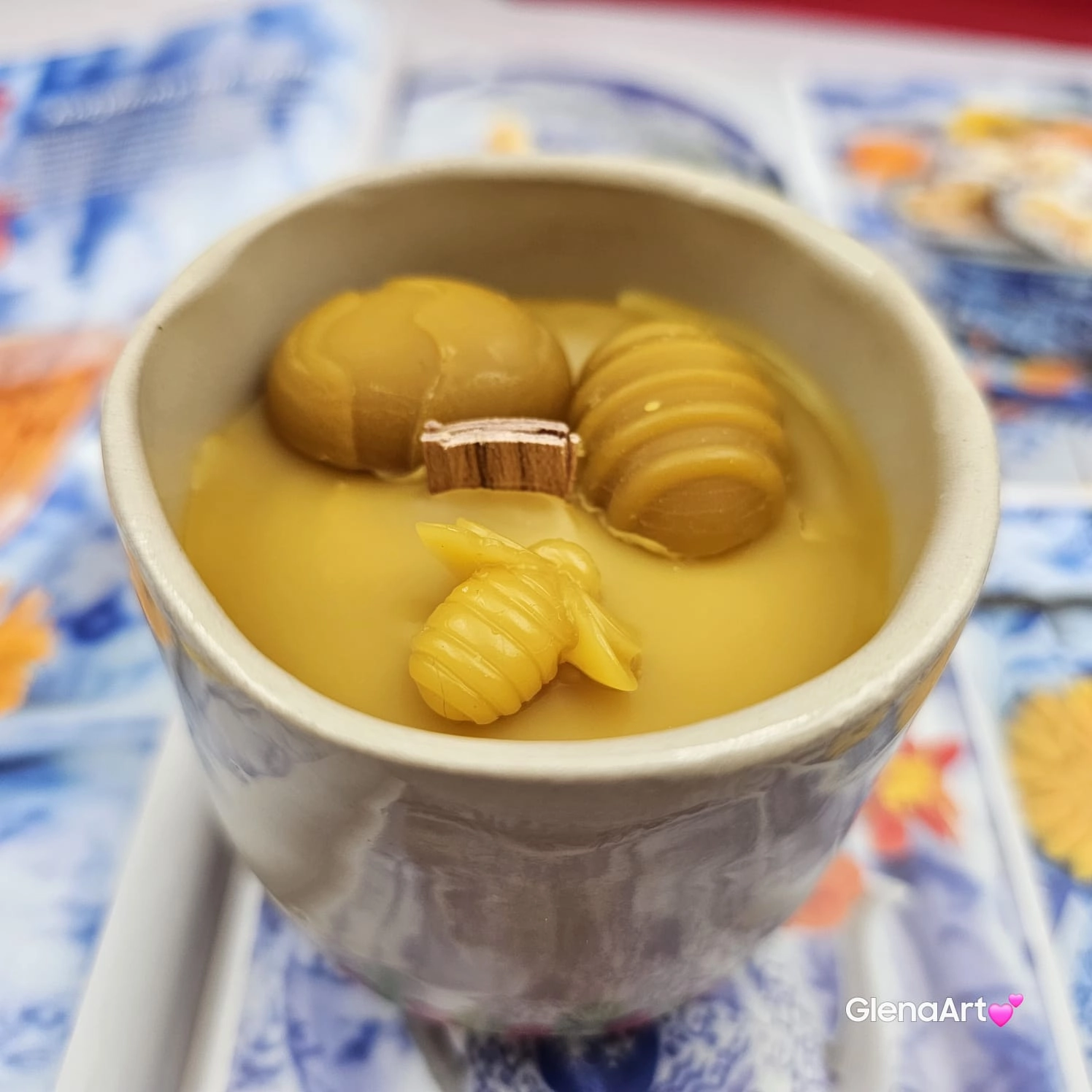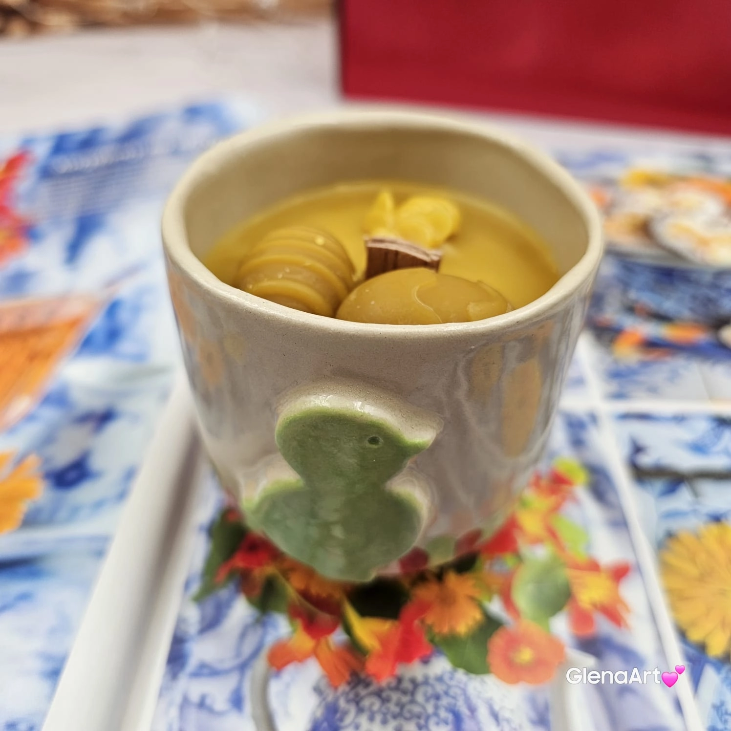 Świeca pszczela zdrowa w ceramice "Złoty Spokój" świeczka z wosku pszczelego w czarce ceramicznej z kurczakiem z 100 % wosku pszczelego ceramiczna świeca pachnąca miodkiem i propolisem naturalna świeczka pszczela 200 g wosk w czarce ceramice wiosennej
