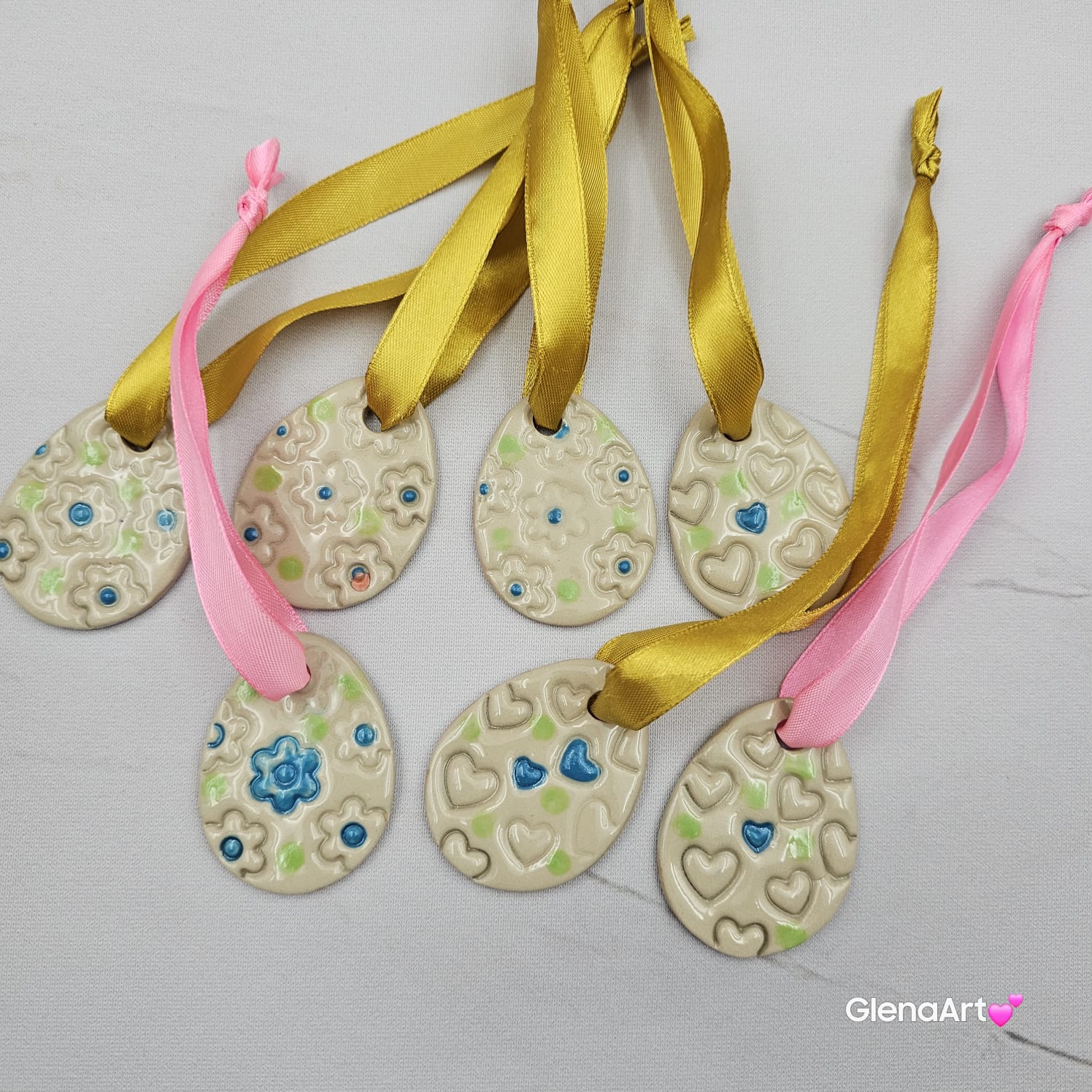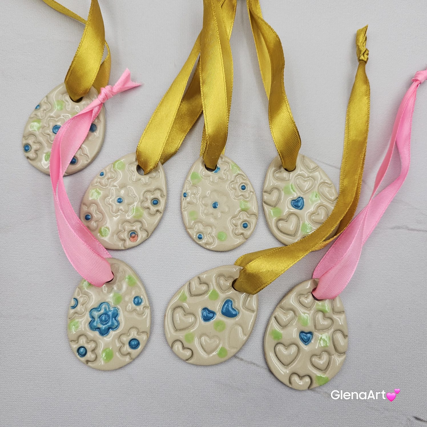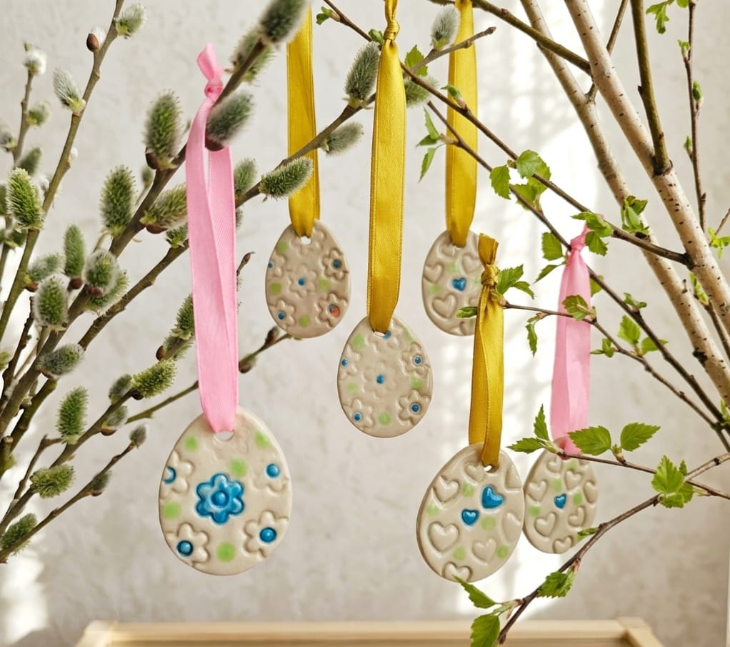 Zawieszka ozdoba ceramiczna na Wielkanoc jajko pisanka na tasiemce zawieszka gałązki bazie na brzózki ozdoba wielkanocna ręcznie lepiona do powieszenia
