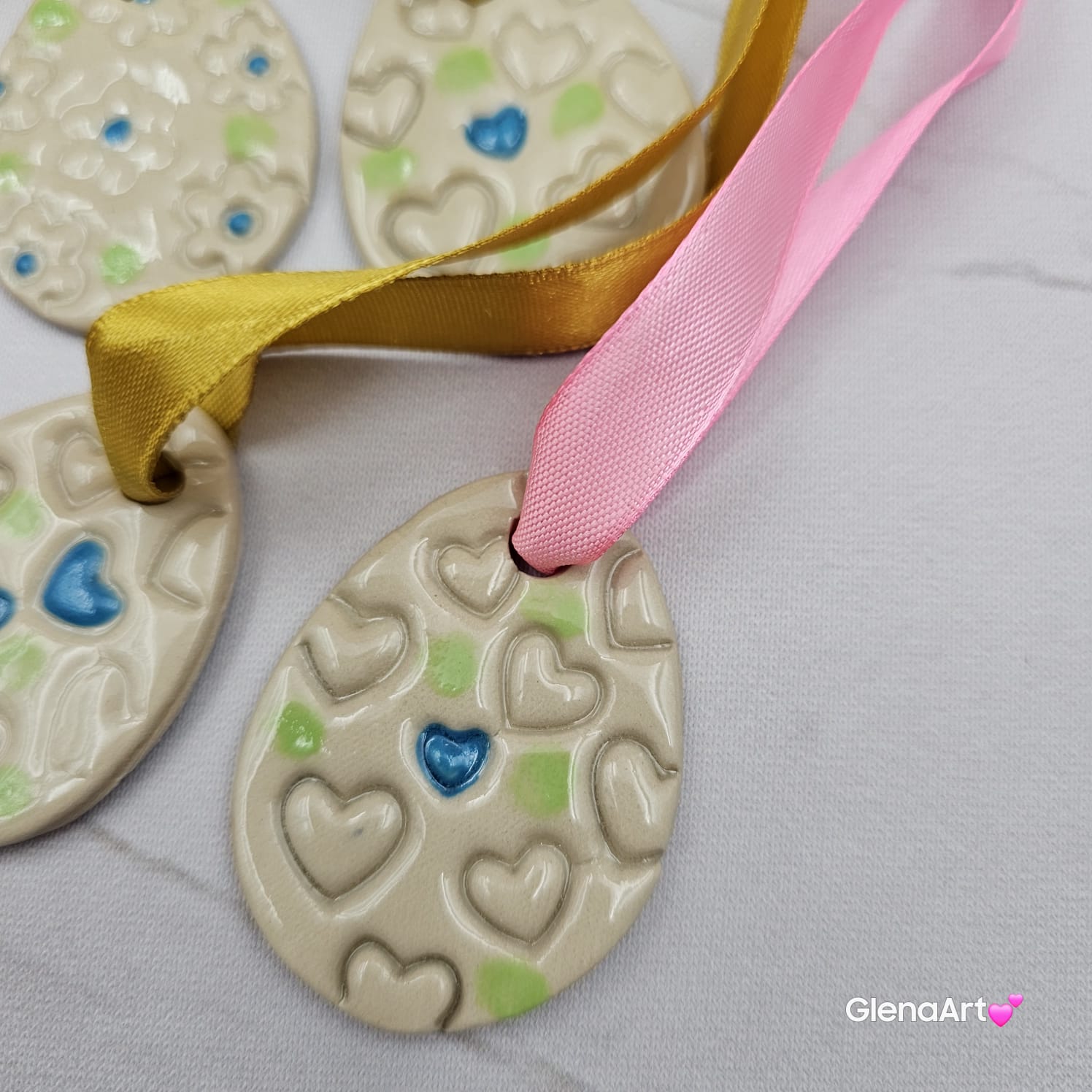 Lekka ozdoba ceramiczna na tasiemce kolorowej. Pomalowana farbami podszkliwnymi oraz transparentem.