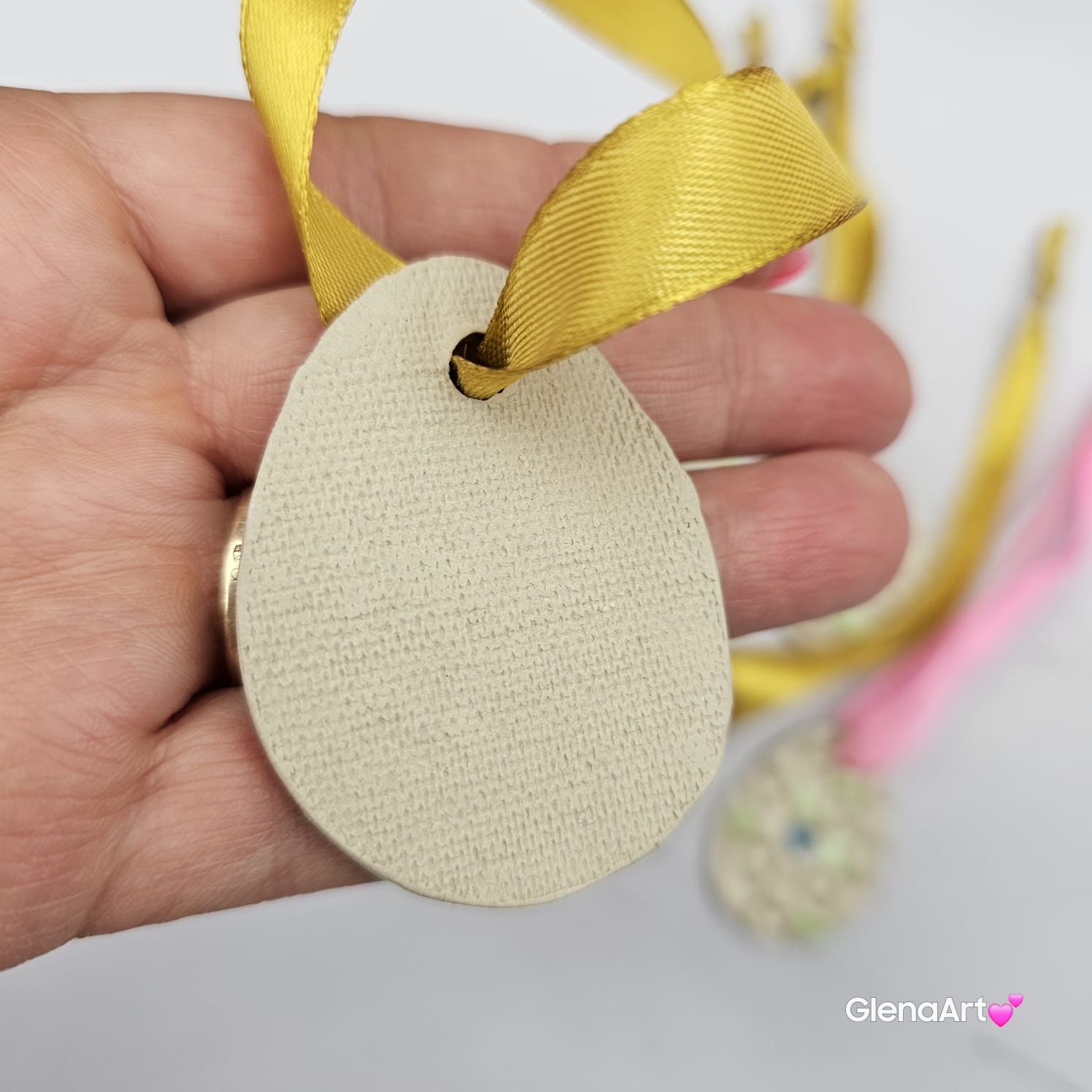 Lekka ozdoba ceramiczna na tasiemce kolorowej.