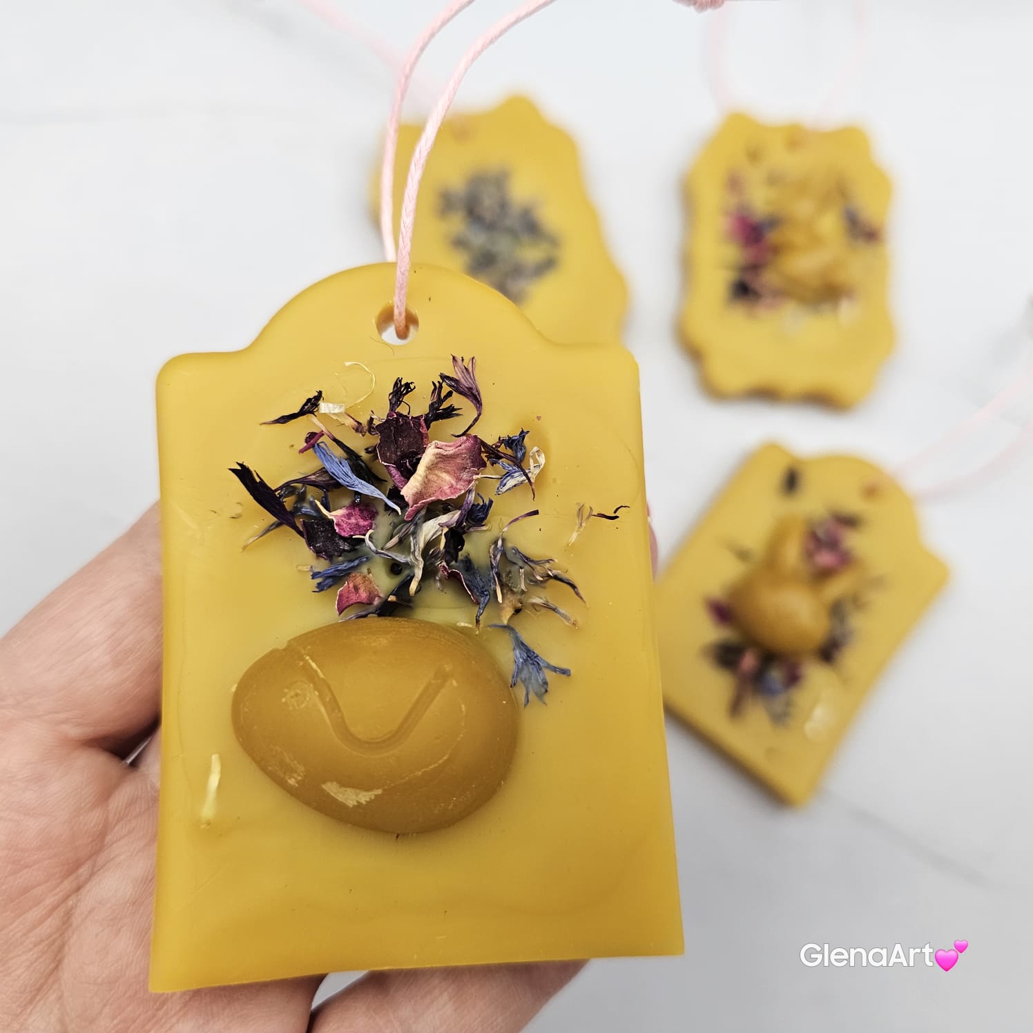 Zawieszka ma wyczuwalny delikatny zapach miodu i piękny miodowy kolor. Obsypana suszkami kwiatowymi.
