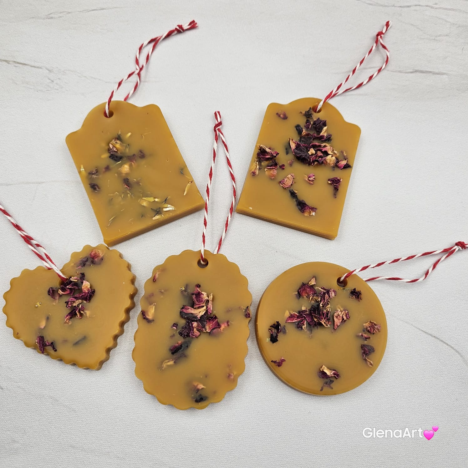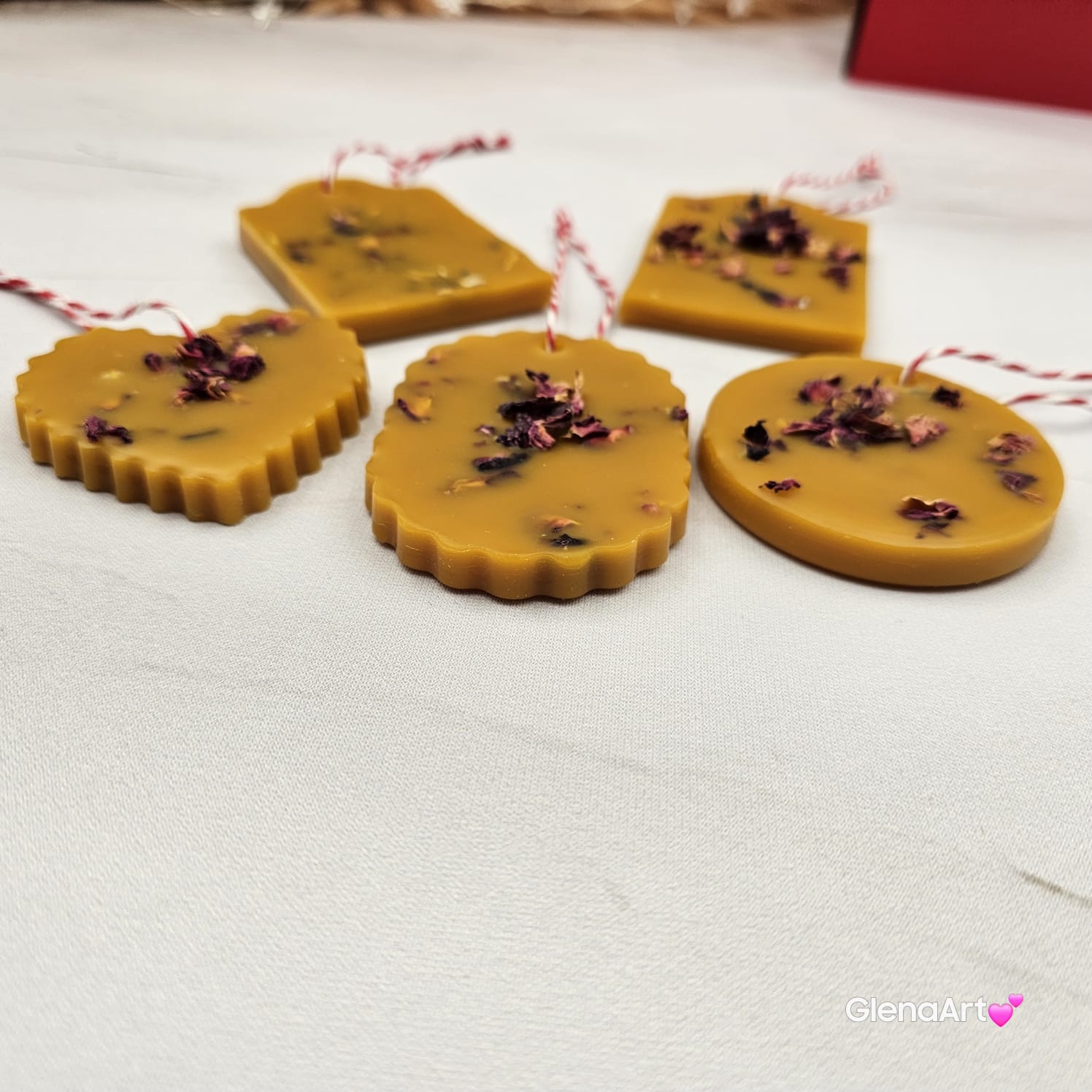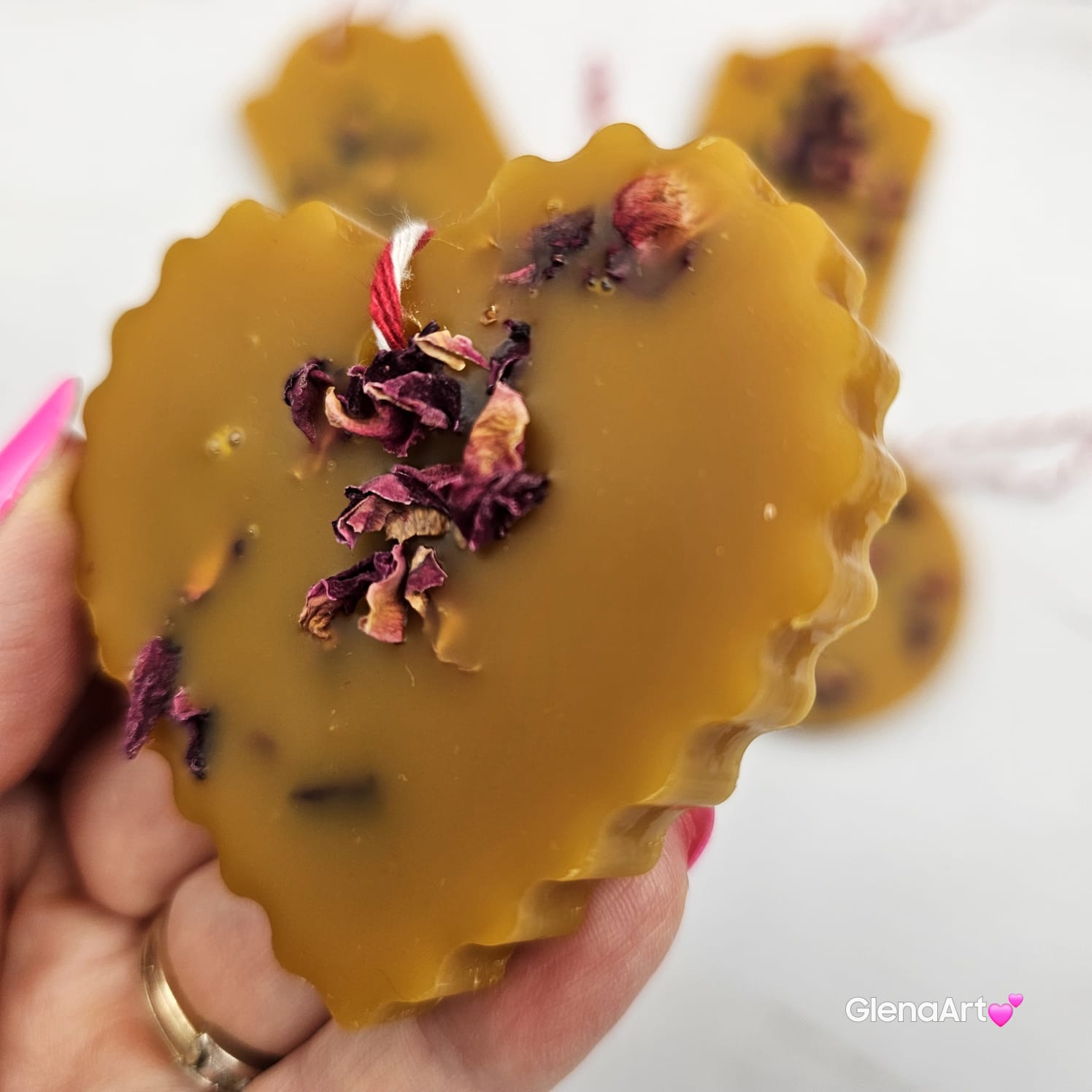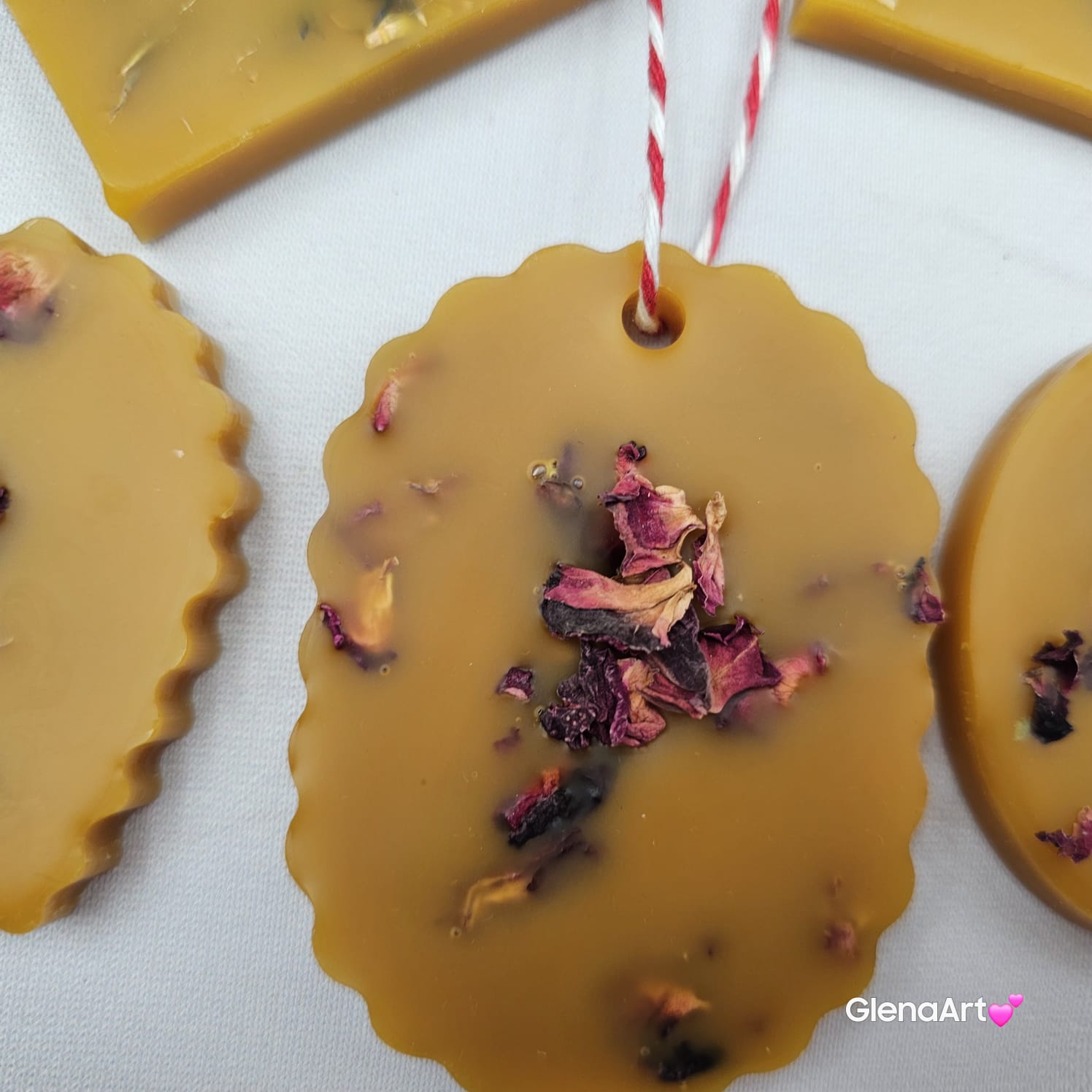 Zawieszka tabliczka florencka wosk pszczeli z suszonymi płatkami róży ozdobna zawieszka z wosku pszczelego 100 % naturalna z suszem kwiatowym pachnąca delikatnie miodkiem i propolisem na sznurku gotowa do zawieszenia woskowa naturalna z wosku pszczelego