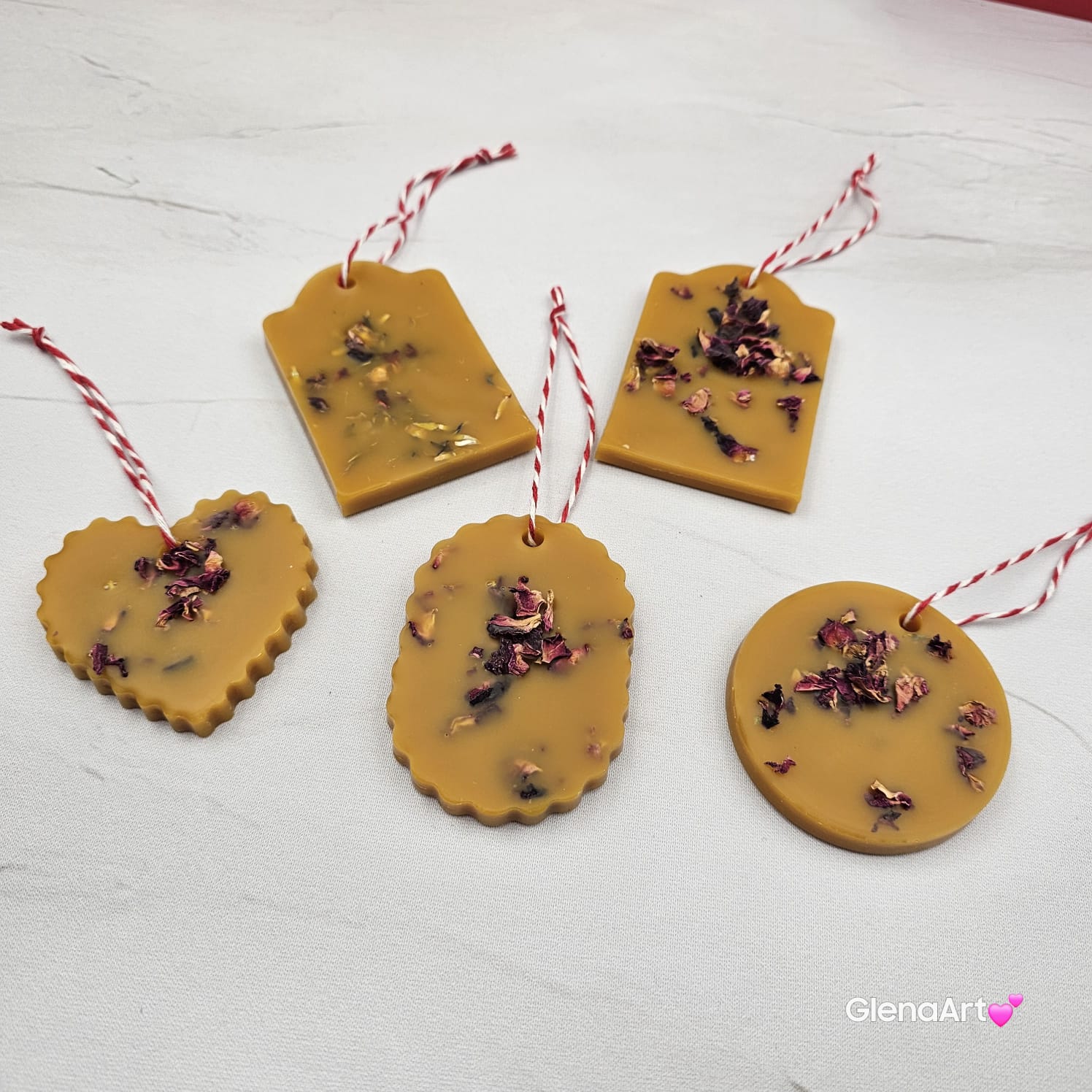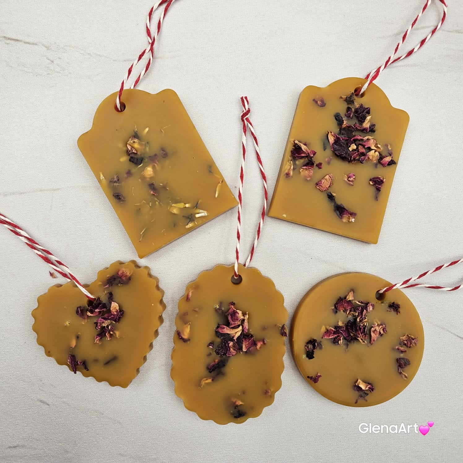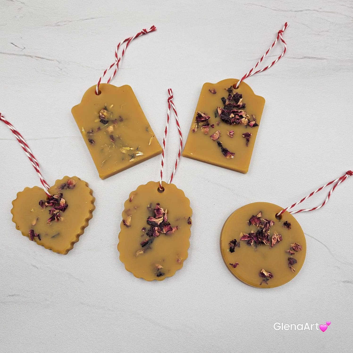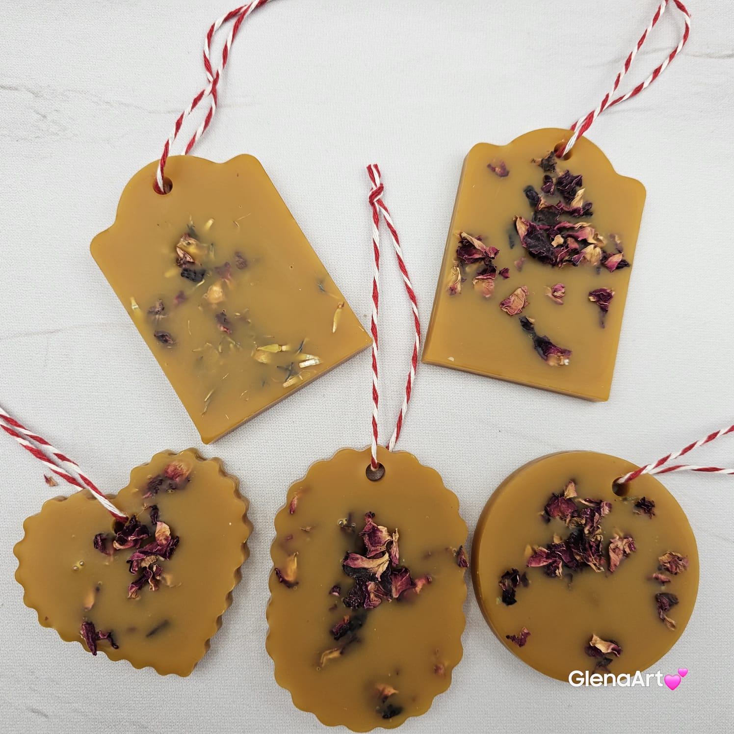 Zawieszka tabliczka florencka wosk pszczeli z suszonymi płatkami róży ozdobna zawieszka z wosku pszczelego 100 % naturalna z suszem kwiatowym pachnąca delikatnie miodkiem i propolisem na sznurku gotowa do zawieszenia woskowa naturalna z wosku pszczelego