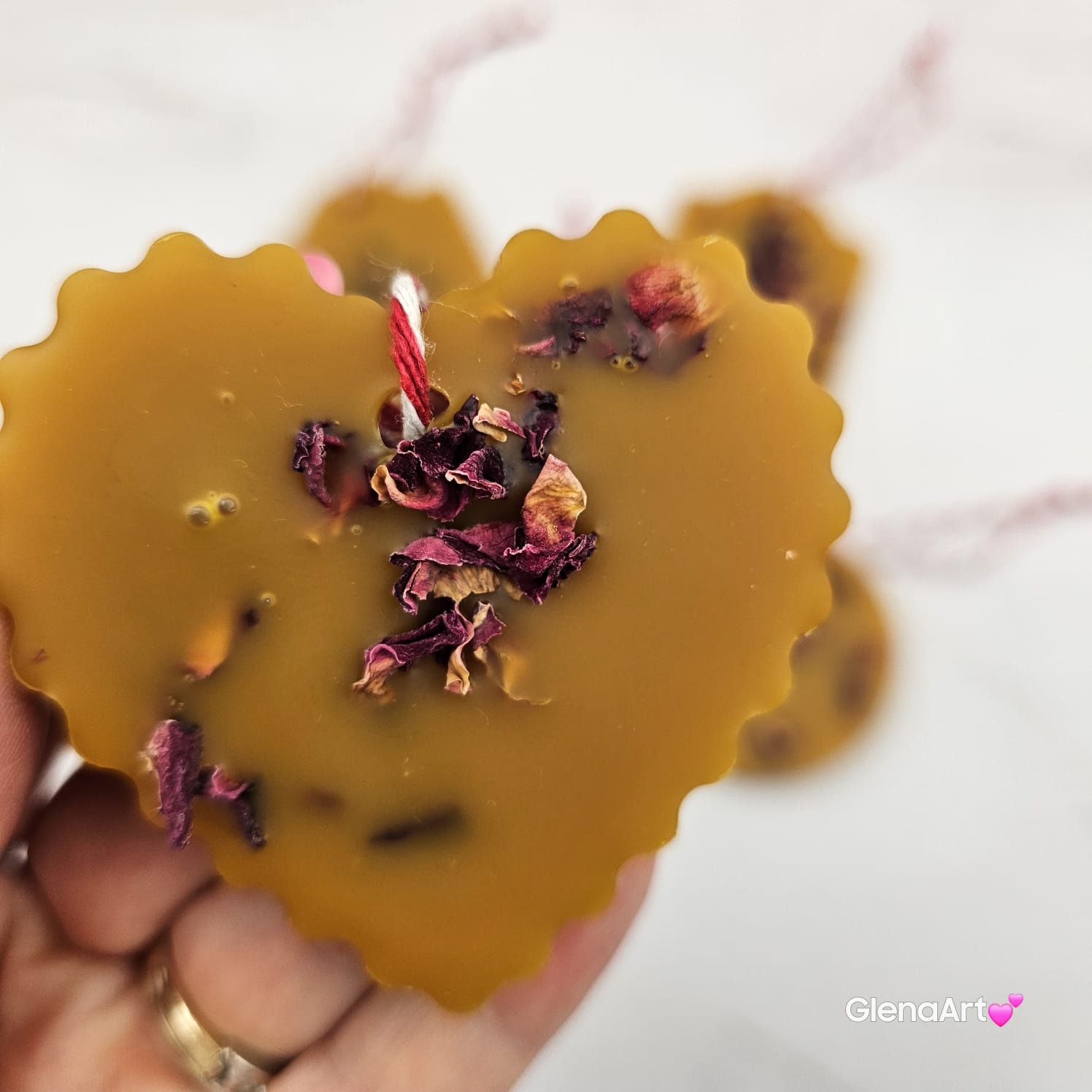 Zawieszka z wosku pszczelego i zatopionymi suszonymi płatkami róż - wykonana ręcznie z 100 % naturalnego wosku pszczelego.