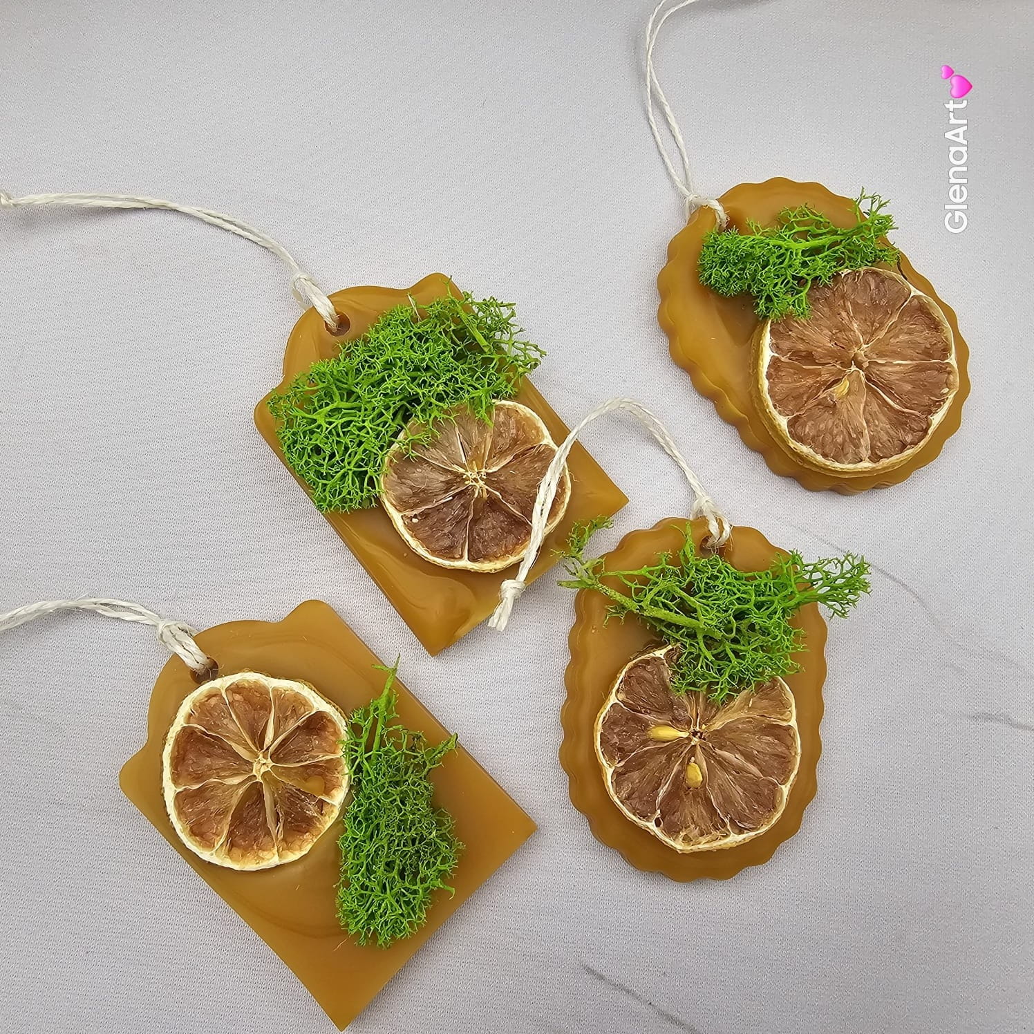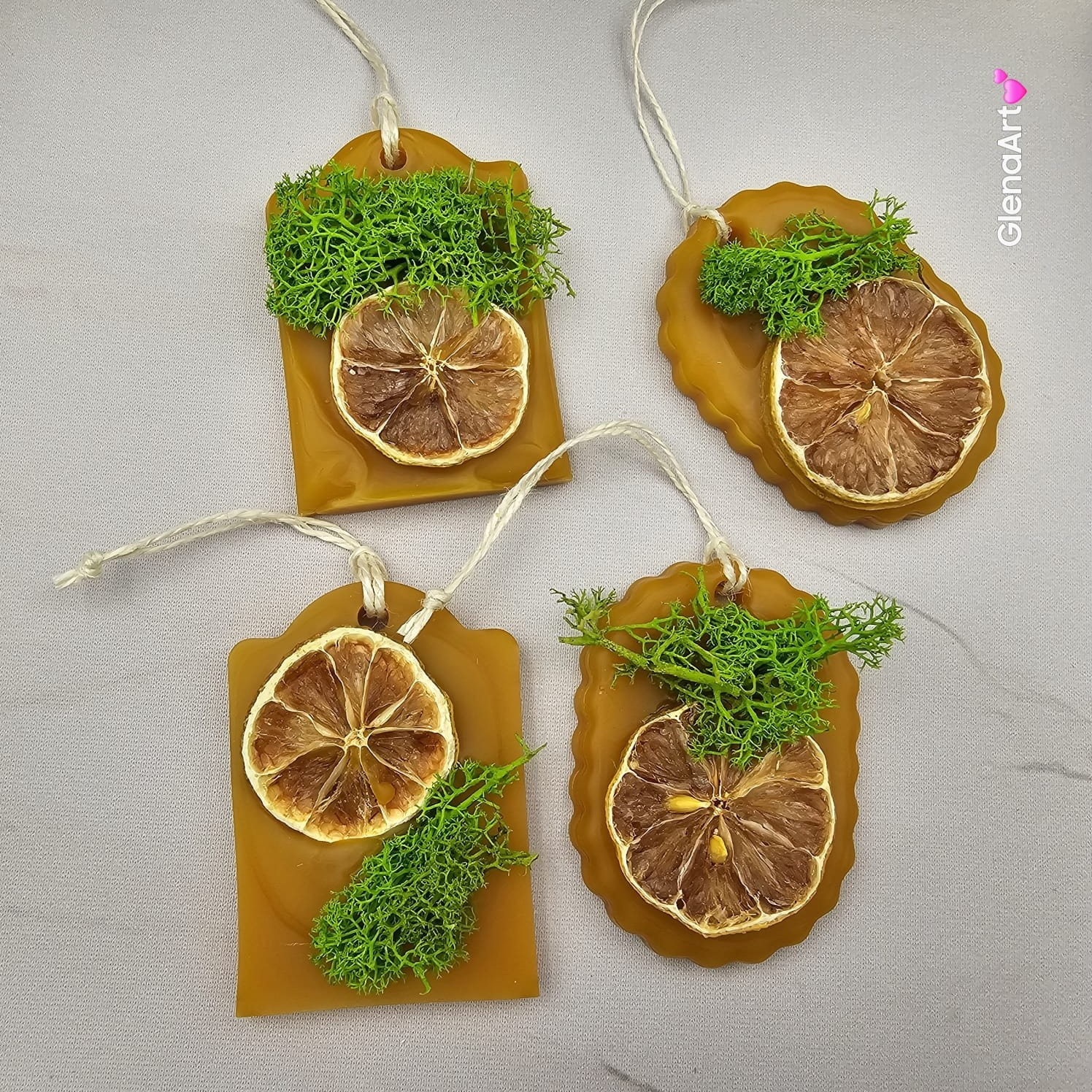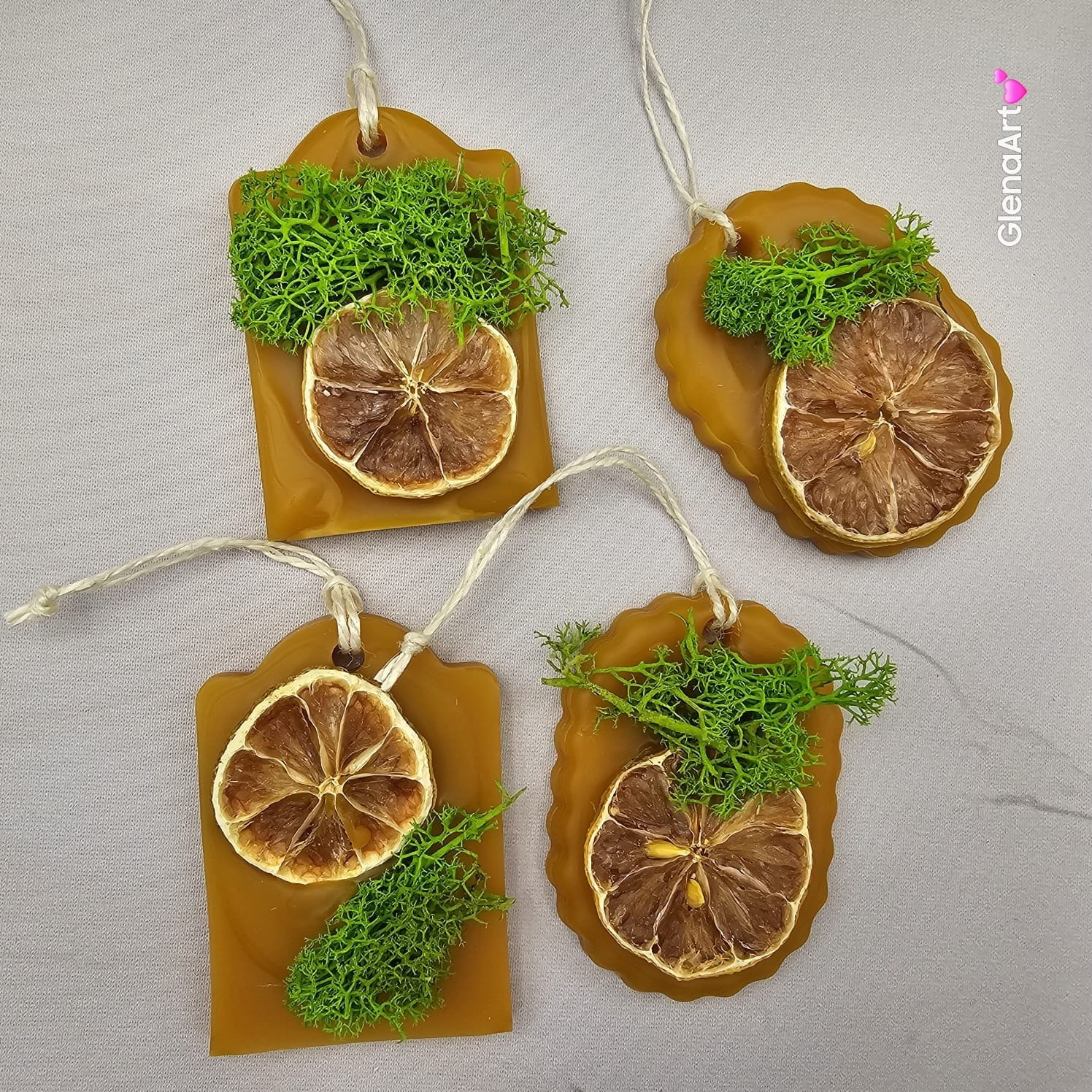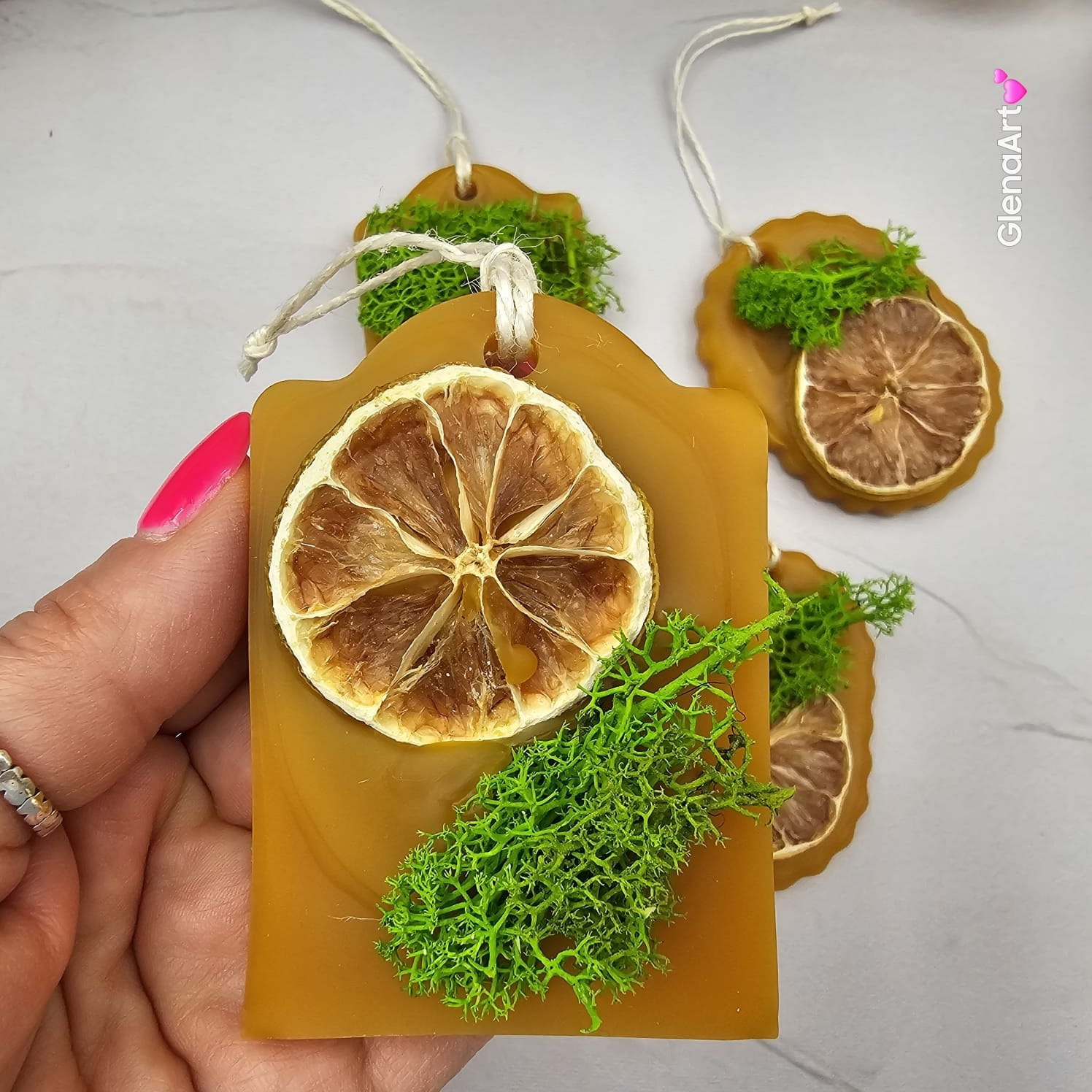 Zawieszka z wosku pszczelego i ozdobiona suszoną limonką oraz zielonym mchem. Wykonana ręcznie z 100 % naturalnego wosku pszczelego